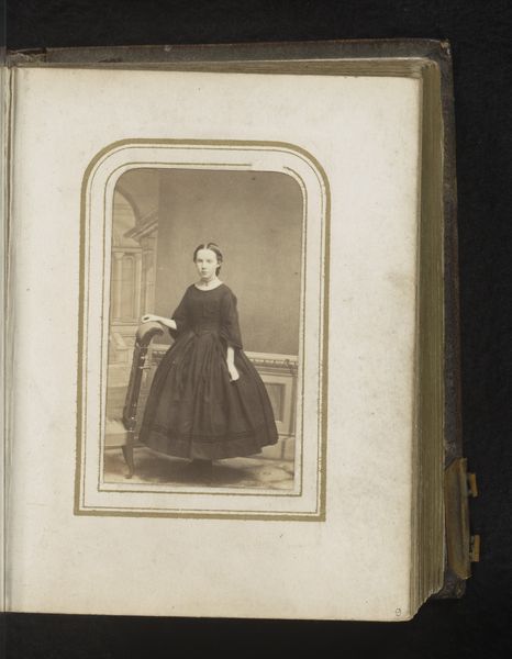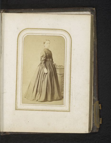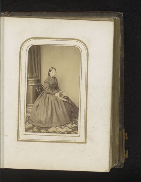 Curator: This intriguing albumen print, originating from the Edinburgh Photographic Gallery sometime between 1860 and 1890, depicts a young woman posed beside a small table or stand. Notice the book resting there. Editor: Yes, my immediate sense is one of constrained respectability. The muted tones and the woman's controlled posture create a powerful sense of...limitation, almost. Is she posing with the book as an emblem of her intellect? Or is the whole arrangement merely for show? Curator: The book acts as a symbol, certainly. In this era, literacy for women signified access to knowledge and a higher social standing. Consider how the artist emphasizes its presence: it subtly mirrors her own composure, its solidity and form acting like a counterweight. Editor: I read her clothing as particularly resonant. The cut of her dress, those puffed sleeves, speaks of a moment in fashion history, but also points to ideas about feminine presentation in the Victorian era. It's all carefully constructed. Do we know who she is, her class background, what freedoms she may or may not have had? Curator: Unfortunately, we lack concrete details about the sitter herself. However, understanding the societal constraints imposed on women of this era provides us with crucial context. Photography itself was becoming increasingly accessible. These portraits democratized representation, allowing more women than ever to cultivate and share their own image. Editor: So, in a way, this image itself embodies both confinement and opportunity. She is posed, her gaze controlled, but simultaneously, there is something quietly subversive in simply existing within the frame and having a document of that very existence survive across decades. Curator: Exactly. Consider how she presents herself-- perhaps attempting to subtly project an inner self-awareness beyond what strict societal expectations permitted? Editor: Perhaps that restrained desire to push beyond norms is what holds our attention to this portrait through all these years. Curator: Ultimately, this single captured moment reminds us of the intricate layers that compose historical narratives. Editor: Leaving me pondering how different the scene would be had we the voice and story behind that thoughtful expression!