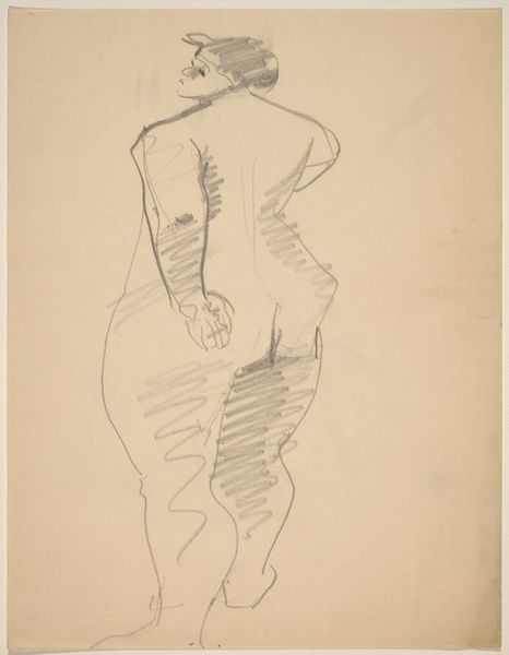 Editor: So here we have Rothko's sketch "Standing Woman in a Bathing Suit." I’m immediately struck by how unglamorous it is. It feels like a quick observation, almost unflattering in its honesty. What are your initial thoughts looking at this piece? Curator: Oh, it's delightfully awkward, isn't it? Like stumbling upon a private moment, or catching a glimpse of someone lost in thought. Rothko, known for his vast color fields, here grapples with the very grounded reality of the human form. But isn't there a tender, almost vulnerable quality, in her stance and the slightly upturned gaze? Editor: I can see that, a vulnerability. Is it unusual for Rothko to focus on figuration? Curator: Very much so! Before his signature abstract expressionism, Rothko dabbled, explored – realism, surrealism. This drawing whispers of his earlier searching. And tell me, does that grid pattern on her… bathing suit?… strike you as hinting at something to come? Those proto- Rothko rectangles perhaps, jostling for position? Editor: Hmm, that's a great point! It definitely foreshadows his later works. It is a figure but it kind of isn't! So, a bridge of sorts. Curator: Precisely. Art is such a trickster, isn't it? What initially appears straightforward – a simple sketch – unfolds into a deeper narrative of an artist’s journey, like a quiet prologue to his better-known works. I now feel I’ve gained insight into how Rothko deconstructed forms to find color itself. How about you? Editor: It makes me think differently about even his most abstract work now, knowing he started here. There’s always a body behind every rectangle of colour, maybe.