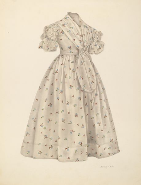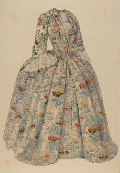 Jean Peszel rendered this watercolor of a "Dress with Quilted Petticoat" sometime in the 20th century. Notice first how the detailed floral patterns of the dress contrast with the plain, quilted petticoat beneath. This juxtaposition creates a visual tension, highlighting the textures and intricate designs. The composition is dominated by the dress's form, which fills most of the frame. Peszel's choice to depict the dress frontally emphasizes its symmetrical structure. Yet, the subtle variations in the floral pattern disrupt this symmetry, suggesting a dynamic interplay between order and chaos. Consider also the use of color. The soft pastels and muted tones evoke a sense of nostalgia, perhaps referencing historical fashion. This choice is not merely decorative; it invites us to reflect on how clothing functions as a signifier of cultural values and identity. Ultimately, Peszel's watercolor is a study in contrasts—between surface and depth, order and disorder—prompting us to question the relationship between representation and reality.