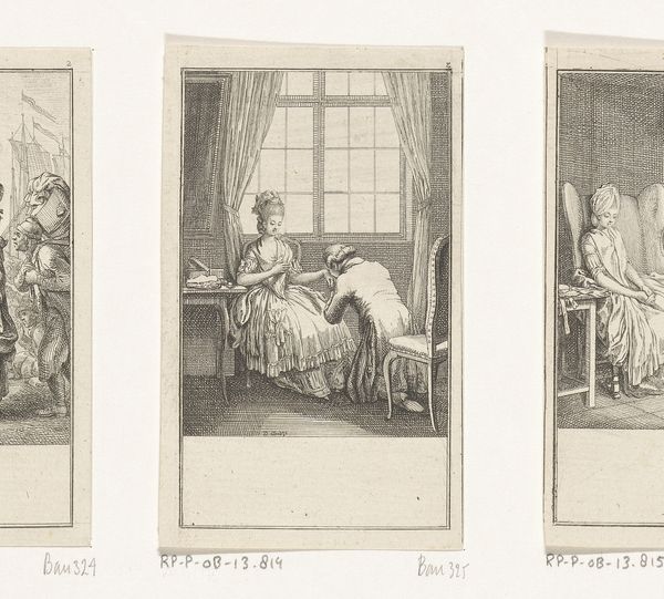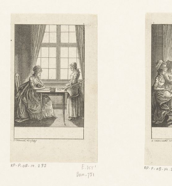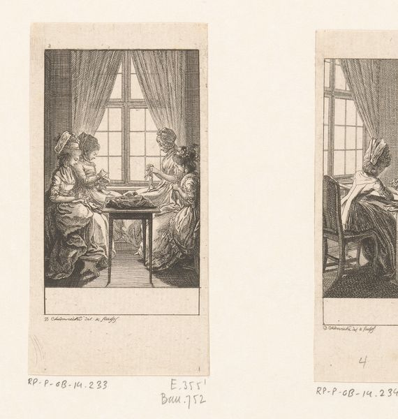 Daniel Nikolaus Chodowiecki made this print, "Voorlezende dame", using etching, a technique with a long history tied to the rise of print culture. In etching, a metal plate is coated with a waxy ground, and the artist draws through this ground to expose the metal. Acid then bites into the exposed lines, creating grooves that hold ink. The plate is then cleaned, inked, and pressed onto paper. The fine lines and intricate details showcase the artist's skill, but also speak to the print's wider social role. Prints like these circulated widely, illustrating books and spreading ideas, and as such, demonstrate a shift in production and consumption of imagery, a reflection of the burgeoning publishing industry, and the democratization of knowledge. Chodowiecki's choice of etching aligns with the growing demand for accessible art, making it an important medium for social commentary and storytelling in its time, rather than an artwork for the elite.