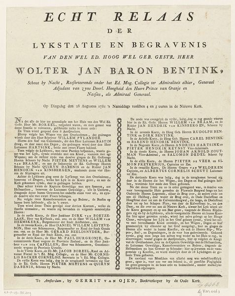This print by Jacobus Kok depicts the funeral procession of Wolter Jan Gerrit Baron Bentinck in Amsterdam, 1783. It offers a fascinating glimpse into the social rituals surrounding death and mourning in the Dutch Republic during the late 18th century. The image itself, with its detailed description of the procession's participants and route, creates meaning through visual codes of social hierarchy. The inclusion of names and titles emphasizes the importance of status and lineage in Dutch society at the time. Consider the role of institutions like the Admiralty, mentioned in the title, in shaping the lives and identities of individuals like Bentinck. Was this elaborate display a self-conscious assertion of aristocratic power in a society undergoing significant political and economic changes? To understand this better, we could consult genealogical records, period newspapers, and accounts of public ceremonies. These sources would help us to understand the social conditions that shaped the creation and reception of this artwork.