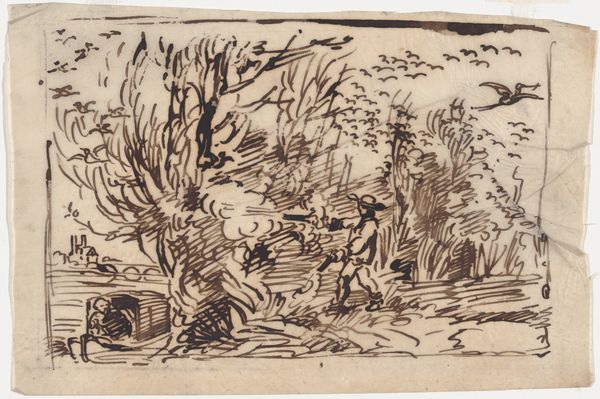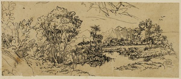 Editor: So this is Rodolphe Bresdin’s "Studies," dating from somewhere between 1822 and 1885. It's a melange of etching, drawing, and ink on paper. Honestly, at first glance, it looks like a collection of doodles, but something about the details is grabbing my attention. How do you interpret this work? Curator: Oh, Bresdin. What a wonderfully strange bird he was! At first blush, yes, it seems like a series of idle sketches, a notepad page brimming with possibilities. But look closer. See how the figures, landscape, and seemingly random objects are rendered with such deliberate detail? It’s as if Bresdin is creating his own personal encyclopedia, a visual lexicon of his imagination. Doesn't it feel as though you're peering into the artist’s subconscious? What do make you of the seeming discordance and strange juxtapositions? Editor: I hadn't thought about it as peering into someone's subconscious. I suppose, like dreams, the juxtaposition of images that otherwise might not make sense when placed together somehow *do* here. It makes me wonder what his process was. Curator: Exactly! Perhaps Bresdin felt, like many artists, that life, nature, and our imagination are fundamentally discordant, and filled with surreal, nonsensical happenings, that resist our feeble, desperate, attempts at imposing "sense" onto them. So he’s not just representing reality, but the raw, unfiltered flow of thoughts and images, the beauty in their chaotic dance. Is that landscape idyllic, or subtly menacing? It's really a work which prompts reflection on nature, memory, and what it means to be a creative, thinking human. Editor: It’s funny how something that looks so casual can hold so much. It has definitely given me a new way to consider how intention and the unconscious mingle in artmaking. Curator: Precisely! And that, I suspect, is exactly what Bresdin intended. It is an invitation for us to slow down and actually observe and ask ourselves "what's going on here."