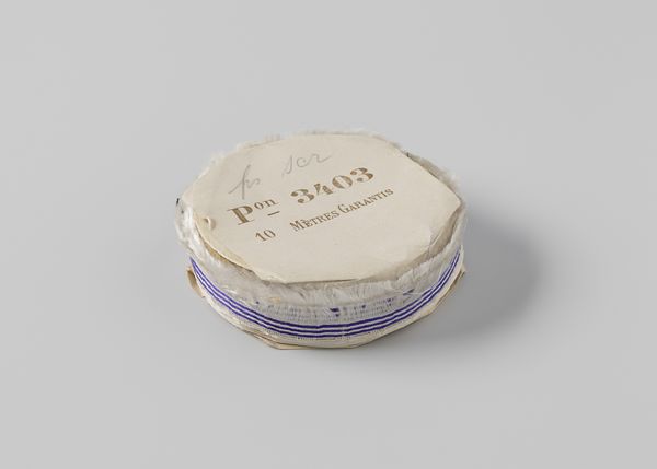 Curator: Standing before us is a still life photograph from circa 1930 by Gustav Schnitzler, currently residing at the Rijksmuseum. It depicts a roll of white ribbon, featuring a single frayed edge and three horizontal blue stripes. Editor: My initial impression is one of quiet domesticity, perhaps a detail glimpsed from a seamstress's table. The palette is muted, and there's a palpable sense of stillness and delicate vulnerability conveyed by the slightly unkempt texture of the ribbon. Curator: The piece is titled "Rol met wit lint met één gerafelde zijde en drie blauwe horizontale strepen"—simply "Roll of White Ribbon…" While seemingly unremarkable, Schnitzler's deliberate framing invites a deeper consideration of everyday objects and their role within a social framework. Ribbon, of course, implies embellishment, class, labor, maybe the societal expectations placed upon women in that era? Editor: Exactly! Ribbon itself is deeply symbolic. Throughout history, it's denoted status, commemoration, even mourning. These blue stripes could represent allegiance or connection to a specific organization or cause. The unraveling edge is also striking. It introduces a sense of entropy, the decay inherent in the passage of time, or perhaps a hint of resistance to the perfect, constrained form. Curator: The artist might have been exploring themes related to industrialization and consumer culture. Mass-produced items became commonplace. We are meant to examine not only its aesthetic value, but also its socioeconomic and political significance. What commentary could he be crafting here? Editor: The paper label tucked into the center is another compelling layer. What is printed on the paper? The specific lettering, font, even its placement evoke a particular period, anchoring the object in time. I think of cultural memory, these are powerful cultural symbols! Curator: Ultimately, it's about how a mundane artifact can illuminate larger narratives around production, gender, and the ephemeral nature of everyday life. It's a clever commentary disguised as a quiet moment. Editor: An evocative testament to the power of seemingly insignificant objects.