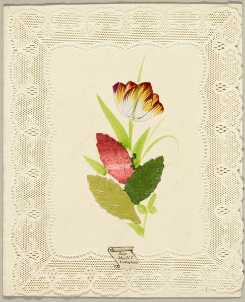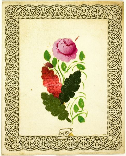 Curator: Here we have an object from the Art Institute of Chicago's collection, a Valentine's card entitled "Love Me or I Die," dating to around 1840. The card features drawing and print work on paper, representative of the Romantic style prevalent at the time. Editor: Whoa, talk about a declaration! Love me or I die! A bit dramatic for a Tuesday afternoon, isn't it? The lace border, that delicately rendered rose, all whisper sweet sentiments, but that little scroll... total mood killer. Curator: That sentiment, while seemingly melodramatic to us today, captures the intense emotionality valued during the Romantic period. Think of the literary and artistic expressions of love and despair, the glorification of extreme feelings. Editor: I suppose so, it just feels, I don’t know...like pinning all your hopes on one blush-colored rose. There's something a bit heartbreaking in that level of vulnerability and that black or dark green leave at the bottom that doesn't go at all with this lovely thing. Is it only me or can you also notice that is the same shape with other leaves? Curator: It also offers insight into the material culture surrounding courtship in the 19th century. Valentines weren't merely store-bought cards. The handmade nature suggests a personal investment. Mass production also greatly impacts access and meaning over time. The ability to access such items allowed an exchange among social groups that never had this possibility. Editor: Okay, seeing it that way is far more appealing, It's this whole ritual, almost like a stage play enacted through paper and ink. This little paper melodrama provides a glimpse into a specific historical script of love and affection. You know it's odd but somehow also funny that only four leaves are colored. Curator: Precisely. These cards operated within established social norms and power dynamics, reflecting gender roles, class distinctions, and the public performance of private emotions. It is an intriguing artifact. Editor: Yes, it truly does invite a peek into a very specific world, a fleeting moment caught in lace and paper. Now I look at it I admire the daring expressed when gifting or creating something like this to give. It’s not for everyone.