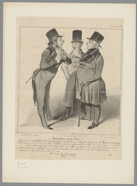 Honoré Daumier created this lithograph titled 'Robert Macaire doet zich voor als bankier' at an unknown date. It depicts Robert Macaire, a figure known for his cunning and deceit, presenting himself as a banker to a group of men. Macaire's hand gesture, placed over his heart, is particularly striking. Throughout art history, this gesture has often symbolized sincerity or trustworthiness. However, in this context, given Macaire's deceptive nature, it becomes an emblem of hypocrisy. We see echoes of this gesture in religious iconography, where saints often hold their hands to their chests, symbolizing devotion. Yet, here, it is twisted, revealing the dark underbelly of modern society, where appearances often mask fraudulent intentions. The presence of such a motif engages our collective memory, tapping into a deep-seated understanding of gestures and their meanings. It underscores the psychological tension between what is seen and what is true, a tension that continues to resonate with viewers across time. It is a powerful reminder of the cyclical nature of human behavior, in which deceit resurfaces in different guises throughout history.