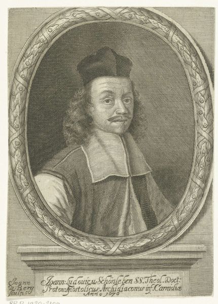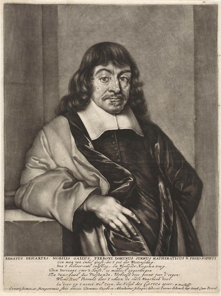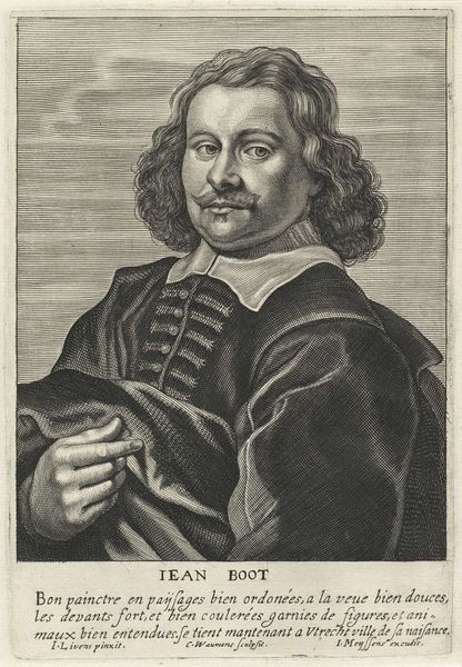 Curator: Here at the Rijksmuseum, we see "Portret van Peeter Stevens," an engraving dating roughly from 1650 to 1800. It's attributed to an anonymous artist, offering us a glimpse into the world of baroque portraiture. What are your immediate thoughts on this piece? Editor: Stark, wouldn't you say? The high contrast creates a sense of formality, but also hints at an underlying tension. The tight composition focuses our attention solely on the figure. Curator: The contrast emphasizes the man's features and attire, highlighting his status. In baroque art, such portraits weren't merely likenesses; they were carefully constructed emblems of identity and social standing. Note the inscription at the bottom--it describes him as a lover of artistic works! Editor: I'm immediately drawn to the texture achieved in the engraving. The artist meticulously uses fine lines to model form and create the illusion of depth, especially in the elaborate collar and folds of the cloak. It seems designed to announce the subject's elegance and importance. Curator: Exactly! And think about the ring on his finger, a symbol of wealth and possibly a familial connection. What could seem like a mundane detail communicates something far more significant, linking the man to lineage and legacy. In addition, the angle and lighting might speak to an artistic homage to Anthony Van Dyck. Editor: Yes, definitely a clear allusion to van Dyck's influence, especially evident in the subject's pose and the attention given to the fall of light. Although, in the execution, I find a rigidity, particularly in the way the light describes the face. It sacrifices some nuance for a certain graphic strength. Curator: That might point to the conventions of engraving, which naturally lends itself to greater graphic definition. I see how the piece captures a very specific moment and worldview, yet resonates beyond its original context. What are your overall reflections? Editor: For me, the portrait reveals the tension inherent in balancing artistic convention with the desire to capture individual presence. Curator: And I think, it serves as a reminder of how portraits carry layered stories, both individual and cultural. Thank you for this interesting analysis!