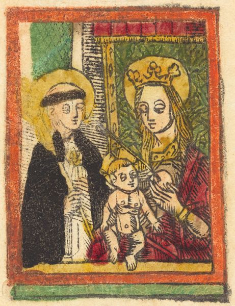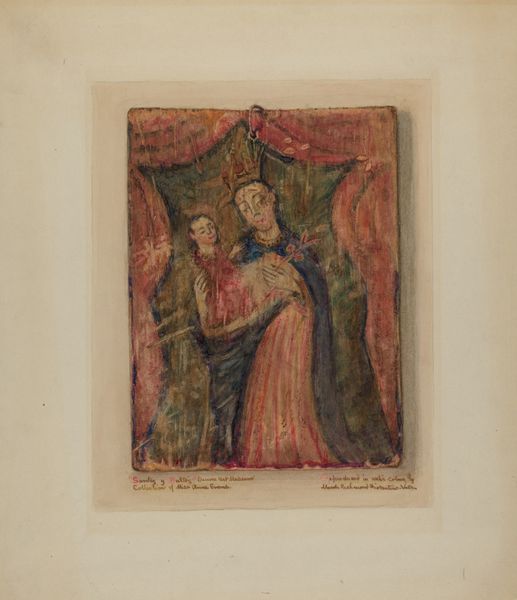 Curator: Here we have "Santos Retablos," crafted by Maude Valle in 1936. It's a work rendered with tempera and watercolor over a charcoal drawing, adopting the portrait style, as you can see. Editor: The somber hues strike me first. A pervasive umber palette lends the piece an almost antiquated feel. What's your take on the materiality here? Curator: The layered application of media – charcoal, tempera, watercolor – speaks to the artistic process. I am also considering the material's implications regarding the societal function and the availability of resources during that period. The piece evokes an academic understanding rooted in its cultural setting. Editor: I see that, but can't ignore how the halo subtly intersects with the vertical plane, fracturing our depth perception. Then there is the rendering of figures and that bold decision to depict a linear cage on the bottom, which does not read convincingly at all. It adds an unsettling element. Curator: The choice of media influences its reading. Tempera lends itself to the meticulous details in representing saints or religious figures in the colonial tradition. Meanwhile, the raw strokes visible from the underdrawing hint at the production process. It’s less about flawless representation and more about symbolic representation. Editor: Precisely! And I wonder if the raw edges and imperfections underscore a raw authenticity, defying the clean lines and flawless surfaces typical of traditional iconographies. How interesting. Curator: It does prompt us to consider craft production—the labor involved. Valle isn’t just creating an image. She is producing an object infused with her hand, skill, and the material’s capabilities within a specific economy. Editor: Agreed. Reflecting upon it, the interplay between technique and the rawness grants this "Santos Retablos" such captivating appeal. Curator: Yes, thinking through process and resources reshapes our understanding beyond simple aesthetics, connecting us to social practices.