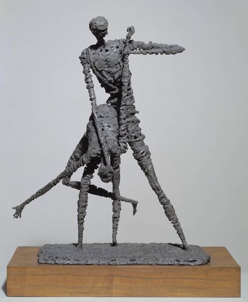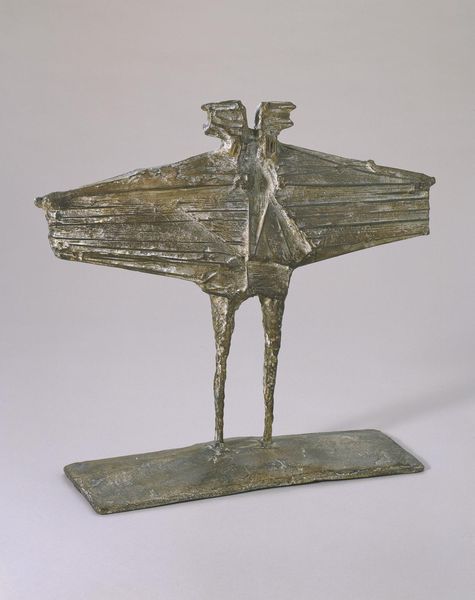 Editor: This is Geoffrey Clarke’s sculpture, "Head," housed here at the Tate. It's so striking! The rough, dark metal and simplified features give it an almost archaic feel. How do you interpret its symbolic language? Curator: Notice how Clarke uses crude forms reminiscent of ancient masks and totems. The exaggerated features—those protruding "eyes" and the blade-like face—evoke power and perhaps a sense of ritual. What cultural memories do these forms ignite for you? Editor: I see echoes of tribal art, maybe a connection to primal human experiences. Curator: Precisely. Clarke taps into a deep well of shared visual history. This sculpture, seemingly simple, resonates with the enduring human fascination with representation and identity. The base itself – rock – anchors us to something timeless. Editor: I hadn't thought about the rock base so much. It really does ground the piece in something ancient. Thanks! Curator: My pleasure. Each viewing offers a new perspective on the enduring power of symbols.