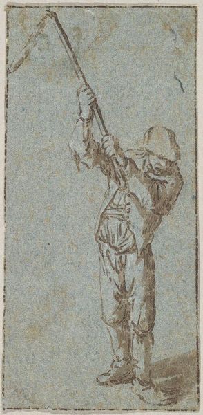 Curator: Rodolphe Bresdin's "Soldier with Spear (?) Looking Left" is a pen and ink drawing measuring a mere 5 x 2.9 cm. Editor: Tiny, fierce, and somehow fragile. It's got this wiry energy, like a captured lightning bug. Curator: Bresdin was a master printmaker, and this sketch offers a glimpse into his working process. Note the material economy, typical for a preparatory work. Editor: There's a raw, almost desperate quality. It's like he’s sketching a memory, something about to vanish. That spear looks as light as a feather. Curator: Consider the social context: Bresdin struggled financially throughout his life. This piece reflects art production within limited means. Editor: I keep thinking about the soldier's gaze. He’s looking left, but what does he see? Regret? Hope? Curator: The lack of finish directs our attention to the foundational materials. Editor: It's more potent because of its simplicity, isn’t it? It's like a whispered secret.