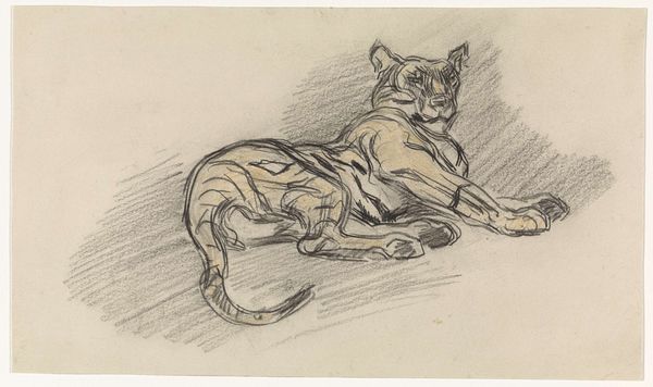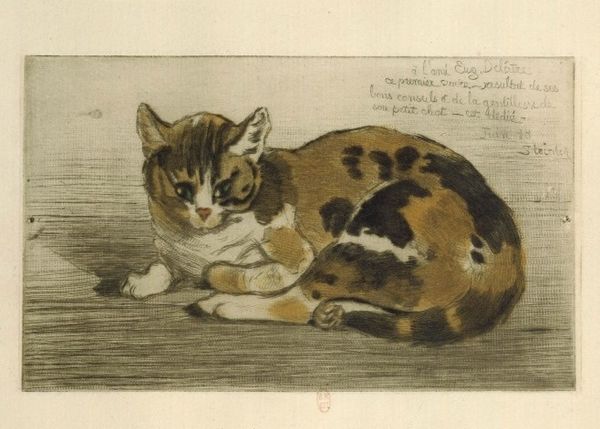 This print, "Winter - Cat on a Cushion," was created by Théophile Alexandre Steinlen, sometime in the late 19th or early 20th century. Look at the way the surface of the cat and cushion is built up through layers of hatching and cross-hatching. It's a real testament to the slow, additive process of printmaking. I’m drawn to the red cushion, a solid, grounding mass that throws the cat into sharp relief. It looks like Steinlen has worked the plate with a dry brush or a textured cloth, creating a tactile surface that contrasts with the smoother areas of the cat's fur. There's such an interesting tension between precision and looseness here. It puts me in mind of Bonnard, another artist who loved to depict the intimacy of domestic life with pets. Both artists share a fascination with the everyday and a willingness to embrace imperfection. After all, art is just one big, ongoing conversation, right?