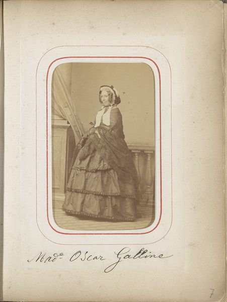 Curator: Let’s dive into this striking piece, simply titled "Portret van mevrouw Manara," a photograph captured before 1863, currently residing here at the Rijksmuseum. The photographer's name is Adolphe Anjoux, and he made it with the albumen print technique. Editor: Oh, the portrait exhales a kind of contained melancholy, doesn't it? There’s an intimacy despite the formal pose. The gray scale does something… almost poetic, doesn’t it? It focuses our attention, but her face, in that muted palette… invites empathy. Curator: Absolutely. Looking at this portrait through a feminist lens, it's interesting how Madame Manara is positioned. The genre portrait and her attire obviously speak of status, yet her pose also has a degree of weariness, almost vulnerability. Editor: That hand, gently resting on the ledge... it feels significant. I mean, this image is far removed from the contemporary performativity we witness nowadays. Perhaps photography hadn’t yet grown comfortable staging those superficial versions of reality that proliferate social media today. Do you sense something of this, as well? Curator: It brings up so many conversations about representation, particularly regarding women in the mid-19th century. In art historical discourse, portraiture often becomes a vehicle for negotiating power dynamics. Was it her own hand to lean over like that or the artist's idea? That would give more content about how photography allows even the most bourgeois women a space of self-definition or to claim certain freedom from within conventions of femininity. Editor: A vital point, indeed! The photograph becomes a social document, unintentionally capturing societal constraints along with personal character. I like to see this. But regardless of context, the soft focus adds another layer of dreamlike vulnerability. In addition, that huge flounced skirt speaks volumes about the burden of 19th-century femininity and even, as you alluded before, status and wealth. Curator: Indeed. All things considered, this is one piece that shows us photography at its most nascent—both as a technical medium and as an avenue for representation. Editor: Leaving me reflecting on what freedom felt and looked like for women not too long ago. Food for thought for modern viewers today.