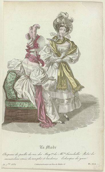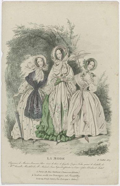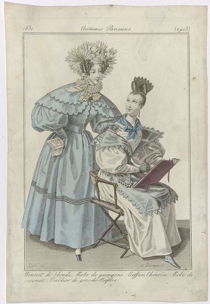 Largo do Quintella created "O Recreio, Jornal das Familias" in 1838, a print that was featured in a family journal during a time of significant social change and evolving gender roles. This print offers a glimpse into the aspirations and expectations of women during this period. The detailed depiction of the dresses, with their elaborate ornamentation and lace embellishments, reveals the importance placed on appearances as indicators of social standing and cultural identity. The women's demure poses are in stark contrast to the complex layers of fabric and decoration, creating a tension between modesty and the material opulence. While these women seem to be trapped in an eternal performance of femininity, it is also worth noting their attempts to subvert restrictive social norms. Are these women adhering to societal expectations, or subtly challenging them through the act of self-expression? Ultimately, this print encourages us to consider the multifaceted nature of identity. It reminds us that even within the boundaries of social constraints, people can find ways to assert their individuality and navigate the complexities of their time.