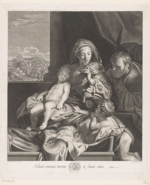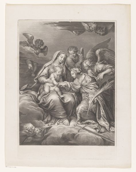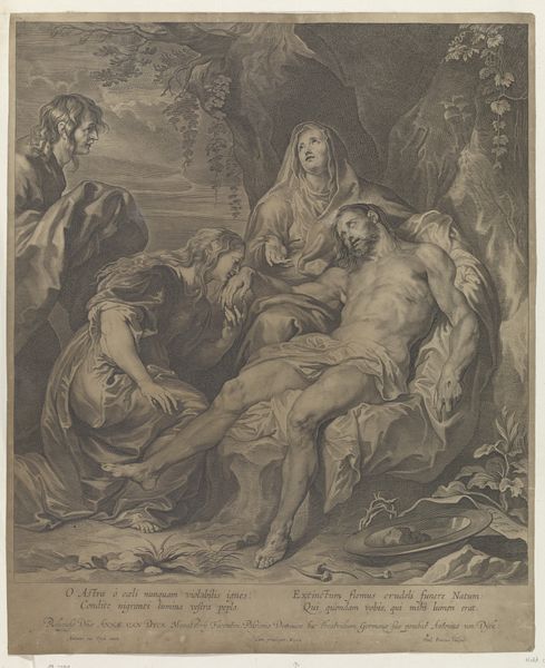 Editor: This painting, "Agony in the Garden," was created around 1620 by Giulio Cesare Procaccini, using oil paints. It definitely has this heavy, emotional weight. How do you interpret this work? Curator: Immediately, I see the tension between the divine and the human, a core concept of Baroque art. Procaccini is inviting us to contemplate the psychological and spiritual ordeal. Look at how Christ is portrayed: supported but also very isolated. He's yearning, yet receiving comfort. Do you see any conflict or contradictions embedded in these dual figures? Editor: I do, the angel seems to have dark, almost menacing wings in contrast to the gentle expression. Is that a common depiction? Curator: Absolutely, think about the history of art— wings and darkness, light and sorrow— these are potent visual motifs, almost primal in their communicative power. Black wings evoke a different kind of angel, not as a friendly guardian but rather the unknown aspect of faith. That interplay suggests a cultural memory of both salvation and looming doom, doesn't it? The men at the bottom sleeping reinforce a type of disconnect as well, an intentional selection. Editor: That makes sense, considering the figures are disciples but cannot stay awake during Christ's most agonizing time. Curator: Precisely. What does that imply to you? Think about the image, memory, faith, culture. Editor: Well, it hits me that everyone in that painting besides the angel is just failing him and the angel shows how faith is helping him. Curator: Indeed. Procaccini masterfully employs symbols to capture the complex layers of faith and humanity's perpetual struggle. These historical symbols are used today! Editor: Thanks for untangling this history within an image! Curator: My pleasure. Hopefully that new understanding empowers the viewing of cultural context today!
