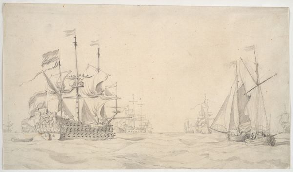 This 1599 etching, "Schepen van het eiland Madura," presents a striking example of maritime illustration by an anonymous artist. The composition is neatly divided, showcasing two distinct ship types contrasted against a calm sea. The structure of the print relies heavily on line work, delineating the complex rigging and hulls of the vessels with precise detail. Note how the artist employs a comparative approach, positioning the ships to highlight their differences in design and function. The vessel on the left is heavily armed with the one on the right appearing more ceremonial or passenger-focused. This contrast may reflect the differing roles these ships played in the maritime culture of Madura. The visual organization, almost like a maritime taxonomy, suggests a desire to categorize and understand these vessels within a broader cultural or colonial context. The artwork prompts us to reflect on how such images contribute to the construction of knowledge and power during periods of exploration and cultural exchange.