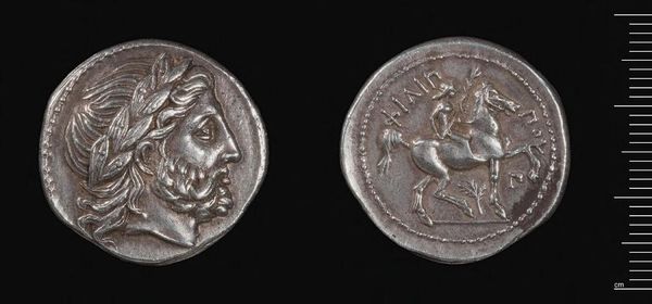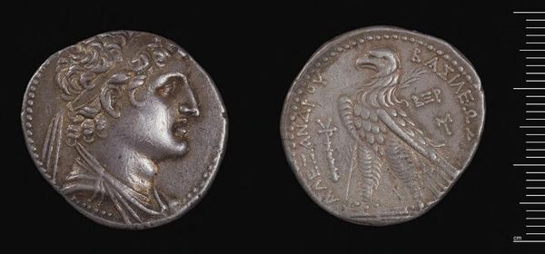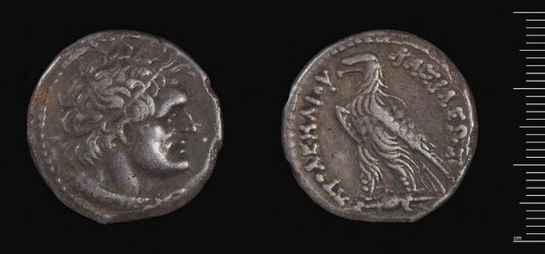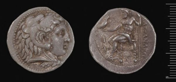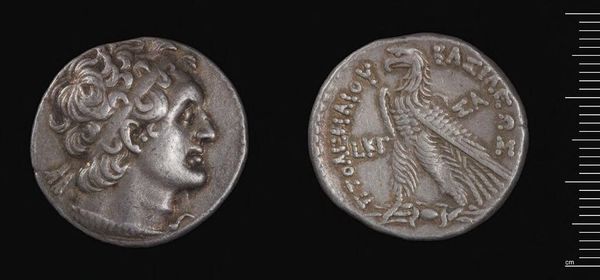 Curator: The Decadrachm of Ptolemy III, a silver coin weighing about 32.66 grams, presents a fascinating case study in ancient coinage and its function as a disseminator of power. Editor: It’s incredible how something so small can feel so weighty, not just physically, but also in terms of the history it carries. The portrait feels severe, almost imposing. Curator: The material itself, silver, was carefully sourced and processed, reflecting the economic stability and technological capabilities of Ptolemaic Egypt. We see craft and labor converging with royal power. Editor: Absolutely, and the depiction of Ptolemy III, while conveying authority, also serves to legitimize his rule within a specific socio-political context. What narratives did this coin reinforce or challenge? Curator: These coins facilitated trade and tribute, connecting disparate regions through a material language of value. This standardized production also speaks to administrative efficiency. Editor: Looking at it now, it's a poignant reminder of how deeply intertwined economics, politics, and identity have always been, rendered visible in something as unassuming as a coin. Curator: Indeed, even today, it serves as a potent tool for understanding power structures. Editor: It's a small object with enormous stories embedded within.