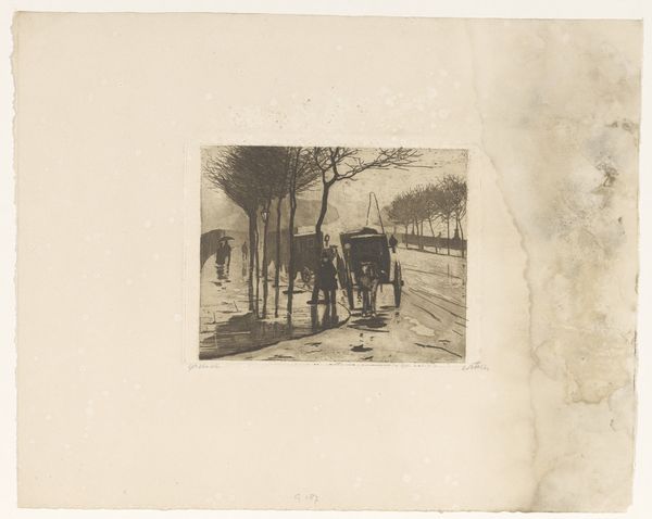 Willem Witsen created this etching, "Waiting Carriages under the Charing Cross Bridge in London," capturing a muted scene through a masterful use of light and shadow. The artwork's composition emphasizes the stark geometry of the bridge's structure against the organic forms of the horses and carriages, creating a sense of depth and enclosure. Witsen uses the etching technique to explore tonal contrasts and textures, evoking the atmospheric conditions of a London day. The deliberate arrangement of elements directs the viewer's eye, constructing a narrative space that invites contemplation on themes of transience and modernity. Notice how the artist uses the formal constraints of the medium to engage with broader cultural ideas about industrialization and urban life. It is an eloquent statement on the evolving relationship between humans, animals, and the industrialized landscape.