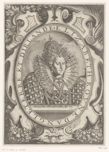 Editor: Here we have Niccolo Nelli's "Portret van Margaretha van Parma, landvoogdes der Nederlanden," an engraving from 1569. The precision of the line work is remarkable; however, I'm also struck by what appears to be an intentional exaggeration of her features—almost a caricature. What do you see in this piece from a formalist perspective? Curator: Indeed. Let's look beyond the subject. Notice the stark contrast, achieved purely through the manipulation of line density. Consider how the oval frame both contains and emphasizes the central portrait while the additional ornamentation with grotesque heads disrupts a purely formal reading of nobility. It is also important to address the artist’s mark-making with the lines’ varying weights generating the form. Editor: So, even within the context of portraiture, a formalist reading focuses on how line, shape, and composition are prioritized? Curator: Precisely. Observe how the engraver uses hatching and cross-hatching to suggest volume and depth. The arrangement of light and shadow guides the eye, even as the severe profile resists complete dimensionality. Are you starting to perceive how the formal elements achieve pictorial interest independently of its function as portraiture? Editor: I do. I initially saw only the historical subject, but now I recognize the dynamic interplay of lines and shapes creating an interesting structure, even apart from who it represents. Curator: A useful skill for navigating artistic practices, is it not? Editor: Absolutely. I’ll definitely be paying closer attention to these formal elements in other works too!