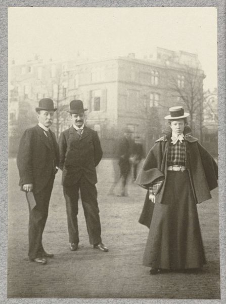 Curator: This photograph, taken sometime before 1900, is titled "Portret van J.B. Aug Kessler en zijn dochters," which translates to "Portrait of J.B. Aug Kessler and his Daughters." It resides here at the Rijksmuseum. Editor: Immediately, I'm struck by the stark formality of the scene. The composition feels incredibly rigid, almost like a tableau vivant. Everyone seems so deliberately posed. Curator: It reflects, doesn't it, the conventions of portraiture at the time, especially photography? It’s meant to convey status, propriety. The Kessler family was certainly a prominent one; this J.B. Aug Kessler was Geldolph Adriaan Kessler. Editor: Right, the social and industrial heavyweight... Makes you wonder what purpose this portrait was intended to serve. To be circulated among family, perhaps a more public declaration of their position? The building behind them becomes part of that visual vocabulary too, doesn’t it? Imposing. Curator: Exactly. That backdrop reinforces their rootedness, their establishment. But look closer – that faint melancholy in their eyes. Photography at the time often had long exposure times so the slightest movement created blurring, but that also gave a heavy stillness to the moment and to each sitter, the viewer reads melancholy into that look. What is the nature of the photographer-sitter relationship? Do they feel the same way as when we quickly snap a picture? Editor: Good point. There’s a weight to it. But perhaps the formality and stillness we initially perceive also lends them a certain dignity. They're not smiling for the camera in the way that would become fashionable, it’s the absence of easy emotion which makes the photo stand out now, but for me. There's a resilience there, isn't there? They look unbending. Curator: Interesting. Perhaps it's both the imposed social construct and their personal character shining through. They own themselves in this moment, while also understanding their responsibilities. That is some fascinating early realism, as such this photograph speaks across history to us, more poignantly than more staged images sometimes manage. Editor: Well, this journey into one family’s attempt at immortality leaves me contemplating the nature of public image and what it is now. I like this somber reflection to take back into the present. Curator: For me too, this seemingly straightforward family portrait proves to be richer in history than one may think; so that helps us question not only past images but ourselves when we present images today.