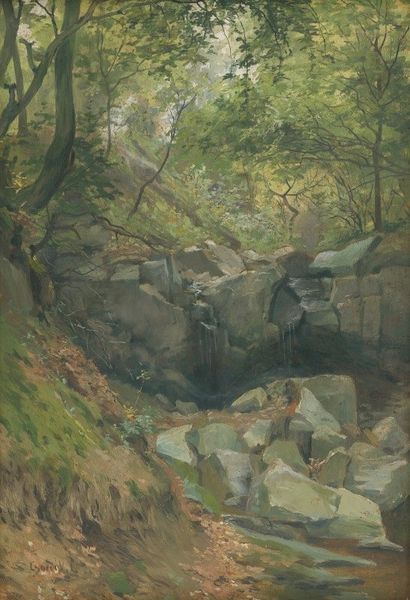 Editor: This is Martiros Sarian's "Hrazdan River," painted in 1903 with oils. It strikes me as quite somber, with all those dark tones. What can you tell me about this work? Curator: The somber palette you notice reflects not just Sarian's artistic choices, but also the social and political climate of early 20th century Armenia. Consider the historical context: this painting was created during a period of intense socio-political upheaval, with the Armenian people facing significant cultural and political oppression within the Russian and Ottoman empires. Do you think that the painting's subject, the river, can then be seen beyond face value? Editor: I hadn't thought of that. Maybe the Hrazdan River is not just a river but also a symbol of resilience or the enduring spirit of the Armenian people despite hardship? Curator: Exactly! Rivers are often potent symbols. And Sarian’s use of impressionistic techniques, painted en plein air, might also suggest an engagement with the fleeting nature of life and the importance of capturing a specific cultural moment before it disappears. This isn’t just a landscape; it's a loaded historical statement, don't you think? Editor: I think so! I now see this muted color palette and loose brushwork are doing so much more than creating a scene - they are telling a story about the culture it represents and how it bravely persisted through hardship. Curator: It also encourages us to consider our present relationship to our histories. Art enables understanding how histories of cultural trauma and resilience impact our present lived experience. I'm glad that Sarian's art allows us to connect with him across all those years! Editor: Me too! I feel I have gained a more nuanced perspective by having learned this about its context. Thanks for illuminating this.