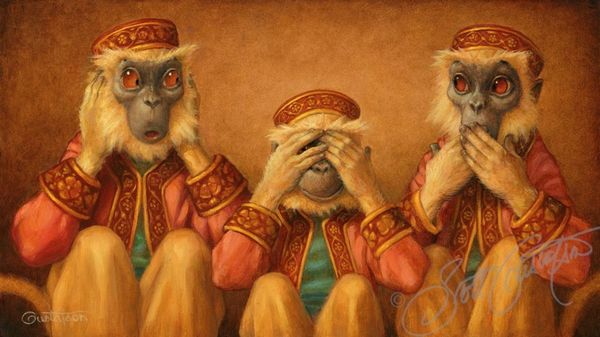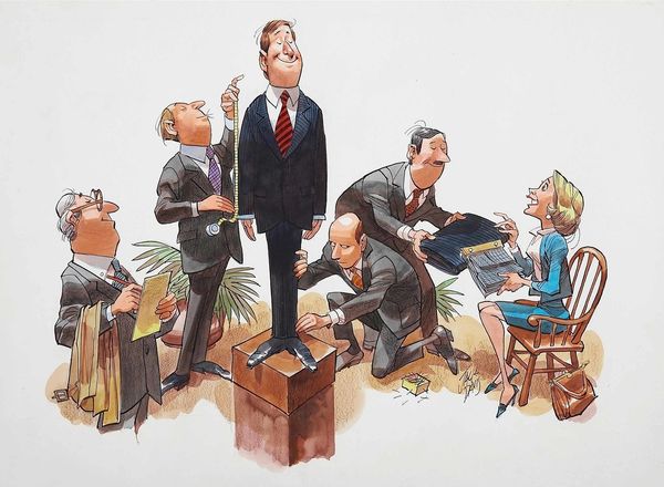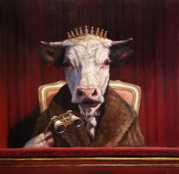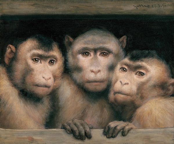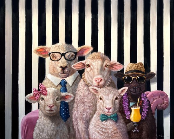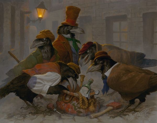 Editor: This is "We, The Jury" by Lucia Heffernan, a painting which I find absolutely hilarious. There’s just so much going on with all the animals dressed up as people sitting in what appears to be a courtroom! What strikes you about it? Curator: What I find immediately fascinating is its engagement with ideas of justice and social participation. Given that Heffernan’s style has been labeled ‘surrealist’, how can that reading challenge our conventional interpretation of law? The animal jury creates a playful but perhaps subversive critique of legal institutions. How does the anthropomorphism, specifically the assigning of human-like behaviours and dress, impact this commentary? Editor: It's interesting to consider it as subversive. At first glance, the animals in their little outfits just made me laugh. I guess the monkey on his phone, and the sloth wearing headphones, is more of a statement about people avoiding the tedious bits. Curator: Indeed. It reminds me of Honoré Daumier's satirical lithographs of 19th-century French courts, mocking the bourgeoisie and legal system. The humor provides accessibility, softening the potentially critical edge, yet it begs us to ask: who *does* participate in the justice system, and who benefits? This brings a complex reading of the painting: while using comedic tones, the imagery offers implicit critique about absent mindedness to democracy. Editor: Oh, wow, I see what you mean! So it's not just a funny painting; it also speaks to wider questions about how society works and how people are – or are not – engaged. Curator: Precisely. Perhaps humor serves as the sugar that helps the medicine go down. What appears 'naive' and jovial could encourage the viewer to question deeper political dynamics around law. Editor: I'll definitely look at paintings differently now; thank you for your insights! Curator: My pleasure! Exploring such questions about imagery allows us to perceive art’s impact beyond a simple visual image and pushes a discussion on ethics.