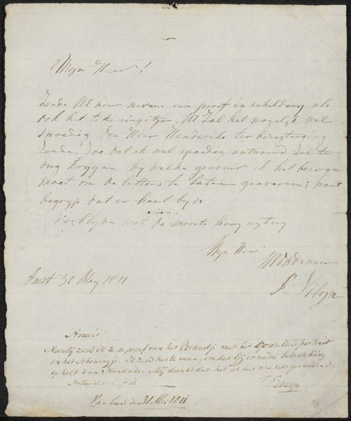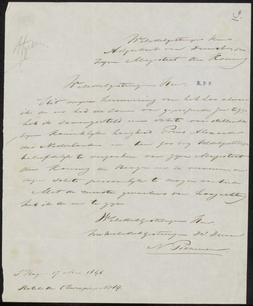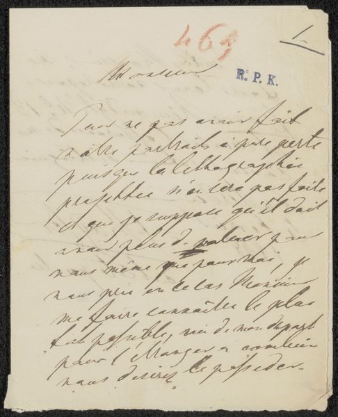 Editor: Here we have “Brief aan Ary Johannes Lamme,” possibly from 1840, by mevrouw de La Berge. It’s ink on paper, and what immediately strikes me is the delicate script. It looks like a heartfelt letter. What can you tell us about this piece? Curator: Oh, it whispers secrets, doesn't it? The way the ink bleeds ever so slightly into the fibers of the paper tells its own story. Imagine the hand that penned these words, probably by candlelight, grappling with emotion, conveying some important thought. What do you imagine was so pressing, to be immortalized in ink? Editor: Perhaps a declaration of love? Or maybe something more mundane, like family news. It's difficult to know given its age and ambiguity! Curator: Precisely! That ambiguity is its strength, though, isn't it? This calligraphic style, bordering on Romanticism, reminds me that even the most private thoughts become artifacts in time. I wonder what Ary Johannes Lamme felt upon receiving it? Did he cherish it? Editor: I hadn't considered the recipient's perspective. The visual texture, with the faded stamp and the author’s elegant signature really do pull you into the historical context. I’ll remember that. Curator: That’s art’s great trick; whispering across centuries! Each viewing is another chance for the artwork to continue revealing itself.