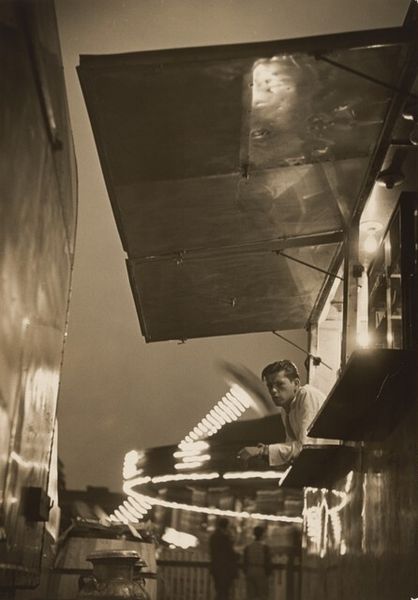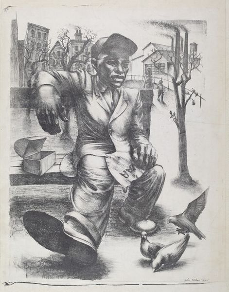 Elizabeth Catlett made this lithograph, "Shoeshine Boy", using stone, paper and ink. I find it so interesting how Catlett uses the lithographic crayon to create these areas of velvety darkness. It’s a real testament to understanding the medium and working with it, not against it. Look how she focuses on the boy's gaze, directing our attention upward, away from the grimy work at hand. The contrast between the rough texture of the shoeshine box and the smooth skin of the boy's face is really striking. Notice the details in the background, the suggestion of a Coca-Cola sign, the architecture indicating a specific time and place, grounding the image in a tangible reality. It reminds me a little bit of Jacob Lawrence, doesn't it? Ultimately, art is about asking questions, not giving answers, and Catlett certainly leaves us with a lot to think about.