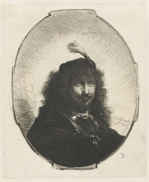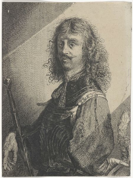 This etching of a possible self-portrait with a plumed cap and lowered saber is on display here at the Rijksmuseum. The artist’s face is framed by a mass of curled hair and a soft hat with a plume. Notice the intricate network of lines that build up the form and texture. The artist uses hatching and cross-hatching to create a sense of depth and shadow, particularly in the face and clothing. This creates a visual push and pull, drawing us in to examine the details, especially the face. The lines around the face are dense, conveying a tactile sense of the man’s features, while the background is left relatively bare, pushing the figure forward. Consider how the artist used line and shadow to shape our perception and create a compelling visual structure. Though the artist is unknown, the technical skill speaks volumes. The portrait captures a moment frozen in time, leaving us to ponder the identity and the narrative behind it.