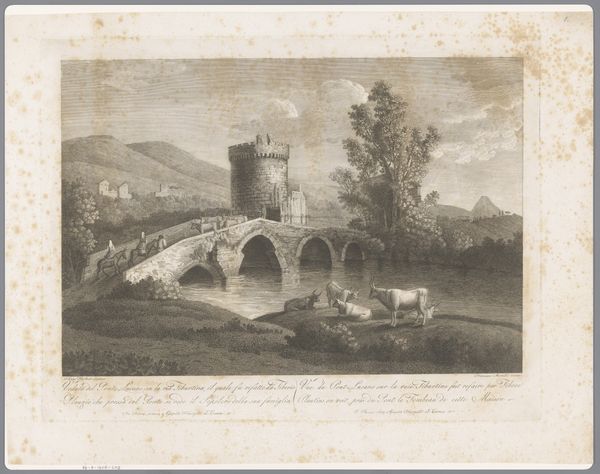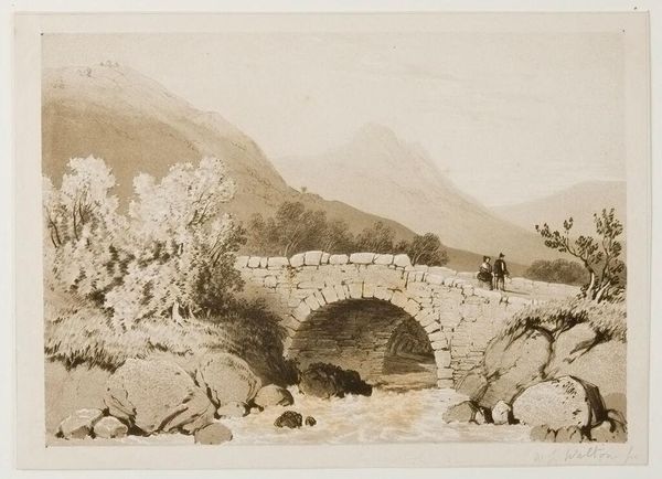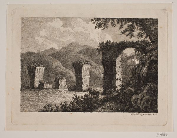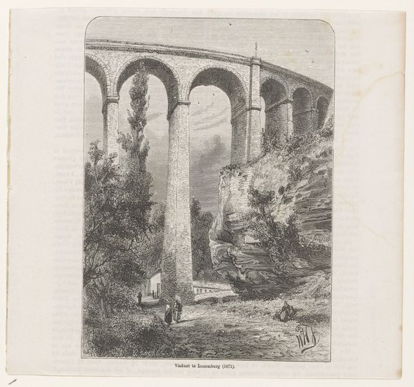 Editor: So, this is "Pont Ambroix," an engraving from 1856. It's quite striking—the bridge feels imposing and timeless. What structural elements jump out at you in this piece? Curator: Immediately, I observe the deliberate employment of line. The artist skillfully uses line to delineate form and texture, particularly in the rendering of the stone blocks composing the bridge. Note how the density and direction of lines create a sense of depth and solidity. What do you make of the negative space? Editor: Well, the areas around the bridge make it stand out more, adding to its scale and history. It's like it is being displayed to us. It appears more monumental as the use of blank space accentuates its isolated grandeur against the soft background. How would you interpret this interplay of structure and space? Curator: Precisely! The contrast highlights the enduring geometric forms of the Roman aqueduct amidst its partial ruin. See how the archways are meticulously rendered, adhering to principles of structural integrity, yet deliberately reveal a state of disrepair through varied textural depictions. We can apply semiotics to decode these details, suggesting perhaps the transience of human creation against the persistent flow of nature, or perhaps the eternal value of roman engineering, do you see it? Editor: That's interesting. I hadn’t considered how much the textures contribute to the meaning, or even of the structural integrity itself! Looking again, the play of light and shadow on the stones does create a sense of weathering. It adds to the structure's statement, its grandeur. Curator: Indeed. The formal elements not only describe the scene but also subtly hint at larger conceptual concerns: time, decay, and resilience through engineering, all embedded in the very structure itself. Thank you. Editor: This has been a fantastic opportunity to view the work through a structuralist perspective! The bridge is an artifact worthy of admiration.