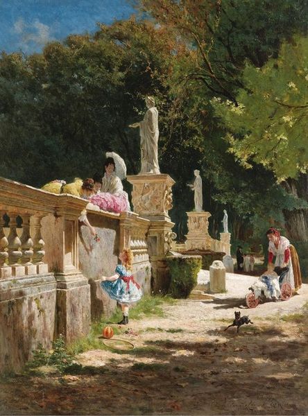 Curator: This painting, titled "Geese and Rabbits in the Yard" by Aurelio Tiratelli, really gives a peek into a particular way of life. There's such immediacy in its realism. What strikes you most about it? Editor: Initially, I’m drawn to the quiet, almost dreamlike quality. The light is soft, and even with all the animals, there's a stillness, an intimacy within the courtyard setting. Curator: It's interesting you use the word "intimacy," considering the piece. Tiratelli's focus, if we see this within its time, places emphasis on depicting everyday rural existence. Considering that many paintings from this period highlighted historical events, there's a sense that it privileges this particular subject. Do you agree? Editor: Absolutely. There is the interesting depiction of the woman as well, on the margins of the painting, as an attendant rather than mistress of the scene. To me, it emphasizes the naturalistic qualities of rural life but fails to disrupt assumptions regarding who belongs in this life. In fact, the animals feature more prominently! Curator: And that speaks to the purpose it serves, perhaps reinforcing an assumed "idyllic" way of living to its largely urban viewers. It's certainly not questioning any social orders but perhaps simply reflects what Tiratelli felt to be aesthetically pleasing or marketable. Editor: The way Tiratelli has rendered the stone walls, dappled with light, makes you consider questions of time, who can "afford" the luxury to laze about when time, after all, is money. Also, the choice of painting with oils gives the scene depth; the impasto technique highlights the textures of both the landscape and figures within it. It's a really tactile experience, I wonder about accessibility to painting resources such as oil and whether this tells its own story. Curator: That tactility pulls us in further, doesn't it? The realism, as we've pointed out, seems to invite a contemporary audience to experience it with the assumed neutrality of art. So there may well be questions of consumption at play. This reflection underscores the multifaceted dynamics in this beautiful, seemingly simple, composition. Editor: Precisely. Looking closely has, as ever, deepened the layers and complicated that initial impression of idyllic stillness.