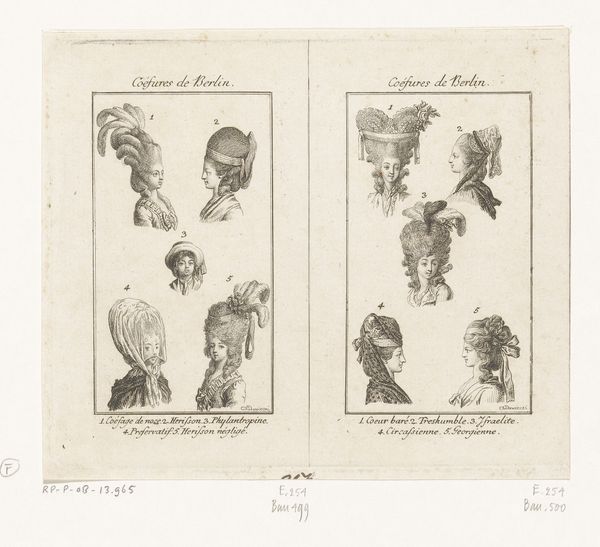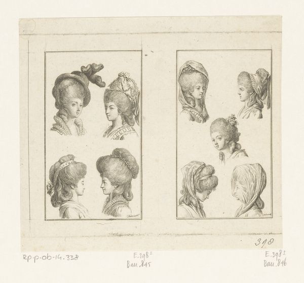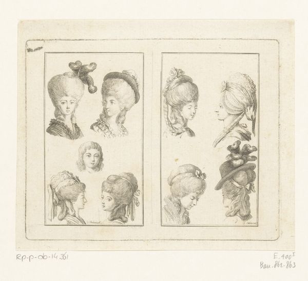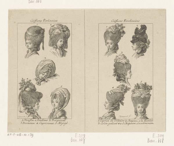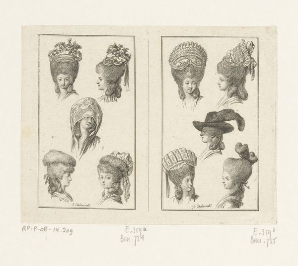This delicate print, "Verschillende dameskapsels en hoofddeksels", was created by Daniel Nikolaus Chodowiecki. The work presents a structured compilation of women's hairstyles and head coverings. The composition is divided into two distinct rectangular panels, with each panel showcasing a variety of coiffures. Chodowiecki's use of line is precise, detailing the intricate styles with a clear, almost scientific approach. The delicate cross-hatching and fine strokes define the textures and forms of each hairstyle, from elaborate, floral-adorned hats to simple, elegant headscarves. The organization of the hairstyles into a grid-like arrangement imposes a sense of order onto the subject. It brings to mind the Enlightenment’s preoccupation with categorization and systemization. The print subtly destabilizes the established meaning of fashion as mere ornamentation, instead, presenting it as a codified visual language. The artist prompts us to decode the cultural significance embedded within these styles.