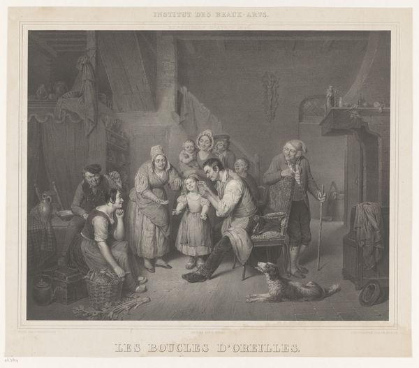 Curator: Immediately, I notice the rich contrasts in this lithograph, how the artist manipulates light and shadow to create a scene that's both intimate and a little absurd. Editor: Well, let’s start by setting the stage. What we’re looking at here is a print titled "Erasmus Montanus," made in 1850, and currently held at the SMK, the National Gallery of Denmark. It’s attributed to Peter Gemzøe. The work appears to be influenced by a dramatic work—do you have some thoughts on this connection? Curator: Definitely! It seems this is based on a play or literary work—probably popular in its time—judging from how theatrical everything seems, you know, in a folk, low-art sense. Editor: Indeed. Think about lithography in the mid-19th century; its availability made art accessible, which broadened cultural horizons, right? Reproducing theatrical scenes in prints put high culture within reach of many. Curator: The figures! Observe their expressions! A scholar figure—likely Montanus—dominates the foreground; the expressions are everything. But I also keep asking myself, what materials were accessible? How did they affect scale? Editor: See how the artist creates texture and detail with the lithographic process? It reminds us of a painterly quality—how light hits the various surfaces: clothing, furniture, faces...The textures really stand out! Curator: Lithography depended on local sourcing for its stone and chemicals, shaping who got to make what, and impacting where the work circulated based on economic routes! The economic element matters! Editor: True, but without an understanding of composition—the careful arrangement of figures in space—and the stark value contrast of shadow that helps focus the eye on the scholar's animated gesturing, wouldn’t we be missing the vital elements in visual language at play? Curator: Both elements combine! The ability to access and reproduce materials informs its reach, democratizing art but also embedding it into networks of consumption, reflecting everyday narratives in these communities. The technique only elevates what materials made possible! Editor: In the end, analyzing "Erasmus Montanus", it seems that engaging with its historical setting or construction lets us find different keys into it; and so even while seeming so conventional or traditionally figurative, the print pushes back at easy interpretations.