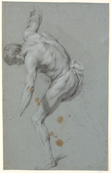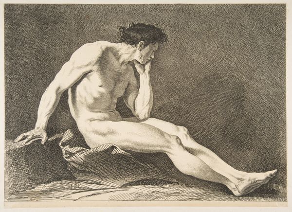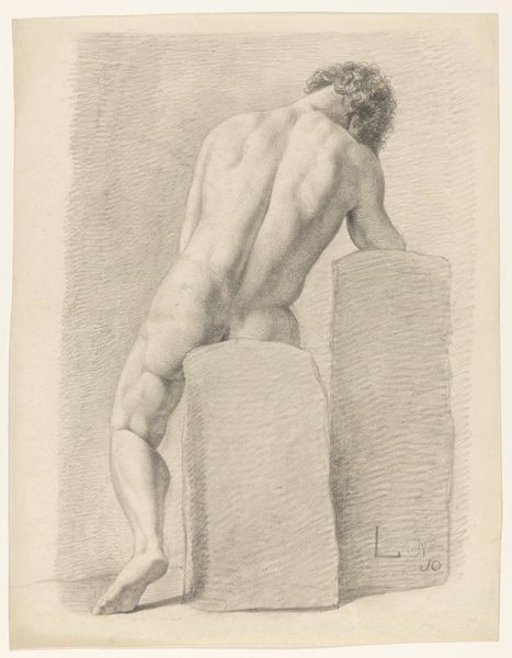 Curator: Immediately, I’m drawn to the physical labor etched in this figure, the muscularity and raw form created with delicate strokes. There's an intensity present in the process evident here. Editor: And I am interested in where this physicality is situated historically. Let’s explore this drawing further. We’re looking at “Kneeling Male Nude, Seen From the Side,” possibly created in 1798 by Johan Christiaan Willem Safft. What can we say about this pencil drawing? Curator: Well, look at how Safft employs accessible, common materials, like pencil and paper, for this figure study. This work appears as part of a larger culture of artistic instruction that favors the study of the nude human form. We're seeing the labor of art education itself rendered visible in the sketch. Editor: Absolutely. The '3rd Prize 1798' in the title is suggestive. It signals the institutional context; the role academies played in shaping artistic styles and training artists like Safft. These prize-winning works shaped public taste, especially given the themes associated with history painting present in this drawing. The artist may well have been tasked to paint subjects related to Dutch or even ancient history, requiring the demonstration of their skills in this way. Curator: Notice, though, how Safft's hand coaxes form from graphite, exploiting light and shadow to delineate the man's physique. There’s nothing ornamental, which speaks to the practicality of his making process. Editor: That may be, yet its presence in academic exhibitions and collections tells us something about the artistic value bestowed upon such works and, as the title notes, even prize-winning status. Consider how academic traditions reinforced notions of ideal beauty and masculinity in the broader visual culture, including, notably, during a tumultuous period in Dutch history, with significant political upheavals occurring during Safft's time. Curator: What stands out to me are the marks of labor. This artwork exists as both the product of education, as you say, but the means of that artistic construction itself. Editor: True. Viewing it today prompts reflection on art’s broader societal functions, particularly the power of institutions to shape and celebrate specific images of the body. A reflection on how these traditions of study endure and adapt through time.