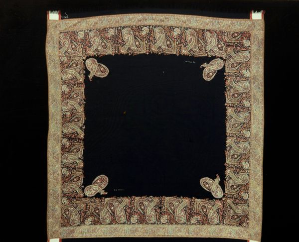 Curator: Here we have a 19th-century textile, identified simply as "Panel," of unknown authorship from the Minneapolis Institute of Art collection. It appears to be woven silk. Editor: Ah, the twilight zone! I’m instantly lost in this deep indigo abyss of geometric patterns. It's dark, almost gothic, but punctuated with glimmers of something…hopeful? Like tiny stars peeking through a stormy night. Curator: Yes, and what looks chaotic upon first glance resolves itself into repeated geometric forms – diamonds and triangles delineated with shimmering threads. One notes the material construction – what looks like meticulous hand-weaving on a silk ground. The repetitive process is meditative, nearly devotional labor intensive. Editor: Absolutely. You feel the pulse of human effort. Each tiny stitch seems like a little prayer, meticulously woven into the fabric of existence. And the texture! It's begging to be touched. I bet it has a comforting weight. What's striking is how the anonymous artisan elevates something so mundane into something transcendent. It invites daydreaming. Curator: It is tempting to speculate about the social circumstances of this devotional act in the 19th century and question, too, its cultural utility as functional item, art object or commodity? Note the degradation of the raw material here: How would the cultural meaning change based on use and its environmental exposures? The repetitive nature speaks to standardized labor in the post medieval time, which moves away from the Guild structure in place at the time. Editor: Yes, I agree. Its survival, that’s the paradox. From its humble origins and anonymous maker, here we are. And its visual music still resonates deeply. Like catching an echo of someone’s song. You know, like catching some ghost melodies. Curator: A beautiful thought, the whispers of forgotten processes indeed still lingering in this Panel’s every fiber. Editor: It makes one feel part of a very, very long human conversation. Thanks for pointing out the labor element. It enriches one's perception and brings one into a contemplative mood.