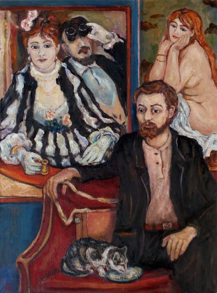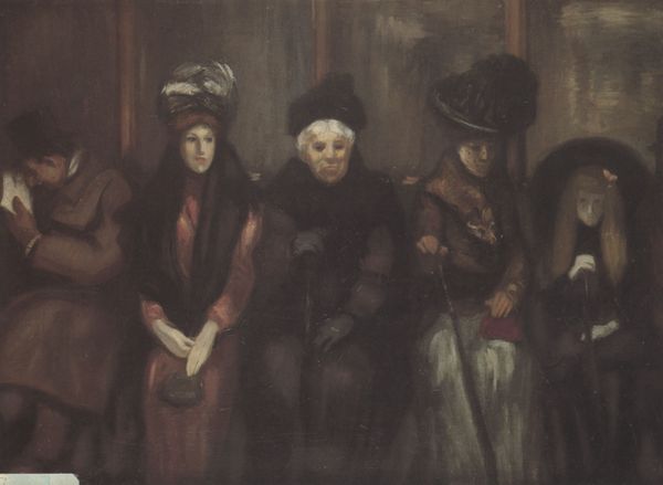 Editor: Here we have Pierre Bonnard’s "The Lodge," painted in 1908. I find the composition somewhat perplexing. The figures seem oddly arranged, almost staged. How do you interpret this work? Curator: Notice the carefully placed figures and their enigmatic expressions. Bonnard invites us to decode a hidden narrative. Consider the symbolism of the lodge itself. Historically, it represents a place of social gathering, often veiled in secrecy and exclusivity. Do you see echoes of that here? Editor: Yes, there's definitely a sense of mystery. It’s like a tableau vivant capturing a fleeting moment in an otherwise private affair. Curator: Precisely! And look at the visual weight of the clothing – it creates a pattern language all of its own. The seated woman’s dark dress absorbs light, suggesting formality or constraint, in contrast to the lighter hues of the figure in the background. The man’s clothing divides the painting almost like the bars of a prison. It begs the question, who is on display here? And what does it all mean? Editor: The composition does evoke this push-and-pull between privacy and public presentation, almost a psychological drama. Are there further hints in the gestures? Curator: Absolutely. The gestures, almost frozen in time, speak volumes. Notice the hands – the way they hold objects, their tension or relaxation. How might those details reveal the underlying emotional currents or social dynamics at play? It reminds me of similar visual language in Chekhov. Editor: I hadn’t considered that. So, Bonnard uses these visual cues – setting, attire, gesture – to create a sense of ambiguity and psychological intrigue. It's more than just a portrait; it's a glimpse into a world of social rituals. Curator: Precisely. Bonnard reminds us that images are never neutral; they carry echoes of shared cultural understandings. Editor: I see the piece with new eyes. Thanks for pointing out how symbols and setting play into it.
