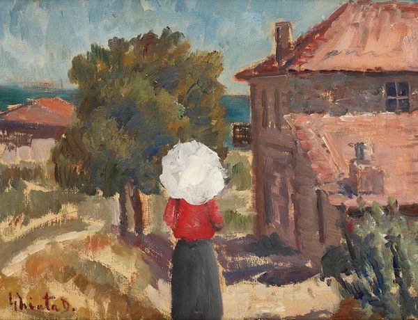 Curator: What a vibrant piece. The thick impasto gives it a wonderful texture. Editor: It has a quaint, rural charm, wouldn't you agree? Something comforting in its simplicity. This is "Czobel Béla Landscape." Curator: Yes, the name seems apt. Tell me more about Béla Czobel, if you would? I am really taken with how the layering of paint conveys so much about place and light. Editor: Well, we unfortunately don't have a precise date for this painting, but we do know that Czobel was a Hungarian artist associated with the Fauves, and later, German Expressionism. He depicted intimate scenes, many centered on bourgeois life. Curator: Ah, yes, I see that influence, particularly in the bright, unmodulated colours. The materiality speaks of someone deeply invested in process; oil paint thickly applied to render the landscape is not merely representation, it's building a world, layering gesture upon gesture. The fabric depicted here is especially fascinating; it’s rough spun material. Editor: Certainly. The work evokes late 19th or early 20th century Hungary, a period undergoing modernization, but retaining strong agrarian roots. This scene—two women outdoors, perhaps resting from work—connects to traditions of genre painting and underscores Czobel's engagement with daily life. The perspective of the figures is not flattering, they’re like props; so you have to wonder whether or not Czobel romanticizes a hard past or actually seeks to question it? Curator: Well said! We also see a connection to Impressionism in the treatment of light, yet, it has a deliberate crudeness, reflecting the materiality that grounds this. Editor: These landscapes highlight questions of national identity. Czobel operated between cosmopolitan art centers and local artistic traditions. Curator: Right. So it’s not just looking at what is depicted but also *who* and *how* the painting came into being, the socio-economic structures around this scene we have. Editor: Precisely. Considering all of those angles makes me appreciate even more that we have included this art in this exhibit.