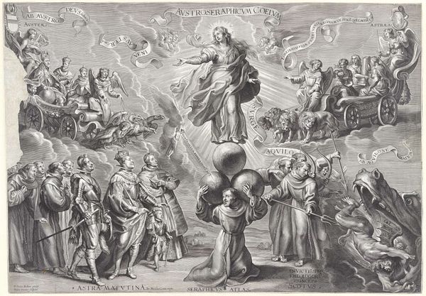 This print, "The Vision of the Son of Man," was made by Salomon Savery in the 17th century. It is an etching, meaning the artist would have coated a metal plate with wax, drawn into the wax to expose the metal, and then bathed the plate in acid. The acid bites away the exposed lines, allowing them to hold ink. The relatively fine lines that Savery was able to achieve indicates the expertise he had with the printmaking process. The visual effect is one of great detail, from the figures' clothing to the radiant beams of light. The textures feel precise and controlled, but also show a remarkable amount of labor-intensive work to communicate a religious vision. Looking at this print, it’s hard not to consider the huge investment of time required to produce a single image, and how this relates to the message of divine power that Savery sought to communicate. By appreciating the means of production, we may better grasp the meaning of the final artwork.