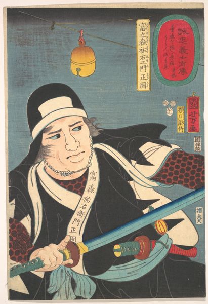 Editor: We’re looking at Utagawa Kuniyoshi's print, "Portrait of Yoshida Sayaemon Kanesada," created in 1852. It's currently at the Metropolitan Museum of Art. I find the figure intriguing. He seems to be hiding something behind his hands, with a really peculiar expression. What exactly do you see in this portrait? Curator: Well, you've hit on something immediately. This print, from the Ukiyo-e tradition, feels a bit subversive, doesn't it? While on the surface it’s a portrait of a loyal samurai, Yoshida, the style pushes towards caricature, perhaps subtly poking fun at authority. What do you make of the buzzing insect design up and to the left, almost like an angry yellow and black wasp with the sting ready? Editor: Hmm, it adds a peculiar touch, doesn't it? Almost like an irreverent signature or a commentary on the subject. Do you think the weapon he’s holding indicates his importance as a warrior? Curator: Potentially. But also, consider the composition, the color choices. Ukiyo-e prints like this weren’t just about depicting reality; they were selling stories, attitudes. That intense blue in the background... does it evoke stoicism, anxiety? What’s he hiding and is it the only thing that he might be hiding? The sword may speak to status but I think his clasped hands and concerned features really lead one to look deeper than merely what weapon he might have had available. Editor: That’s interesting. I hadn’t considered that. It makes you wonder about the stories it could be telling, beneath the surface. Is the message overt or just alluded to and a comment on culture and times. Curator: Precisely! It’s this tension, this visual pun, that makes Kuniyoshi so compelling. He's whispering secrets, daring us to listen closely. Editor: That whisper has turned into something like a scream! Thank you, I have really enjoyed seeing this from an angle that was unexpected for me.