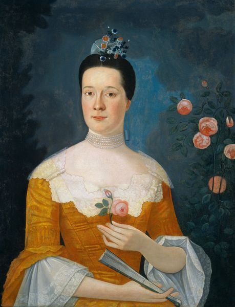 Curator: Let's take a closer look at "Susanna Truax," an oil-on-canvas portrait estimated to have been created around 1740. It presents a three-quarter view of a woman against a simple backdrop, and has strong rococo influences. Editor: The first thing that strikes me is how deceptively simple it seems. There’s almost a folk-art quality to the presentation of her figure. Curator: It's a very intriguing blend of formal portraiture and what might be termed provincial style. What contextual details stand out to you? Editor: The flat planes and almost stiff pose, versus the meticulous floral embroidery detail on her gown create a dichotomy. One can appreciate the symbolism of such finery but question its presentation alongside the less-refined face and figure. Does this say something about the sitter's place in society? Or perhaps about the artist's skill, or available style in the region? Curator: Precisely. Her clothing suggests wealth and status—the fine embroidery being a mark of luxury but also labor. Remember, this was an era when textiles held significant social and economic value, which definitely places her. And how might this garment construct and reinforce identity? Editor: Her hands also look delicate. Perhaps she’s from a class that is shielded from manual labor. Then the artist depicts an intriguing and almost awkwardly posed landscape backdrop over the right shoulder. It is likely intended to denote property and stature, too? Or the beauty of the American landscape for settlers? Curator: The painting subtly encodes the emerging social order and gender dynamics. The controlled landscape, the elaborate but restricted costume: they collectively speak of constructed identities and social aspirations. Editor: Considering this painting, I reflect on the limitations placed on women, whose identities were intricately tied to their social status and their domestic roles. While seemingly celebratory, this piece also invites us to examine the lack of agency for a certain strata of people at that moment in American history. Curator: A good reminder to always consider what is seen, unseen, and how its image has persevered in our contemporary exhibition spaces.