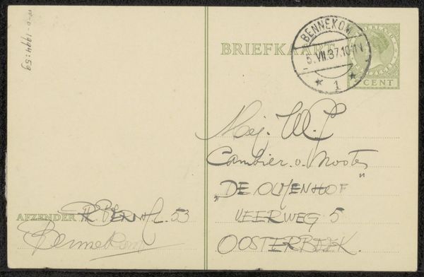 Editor: So, this work is a postcard entitled "Briefkaart aan Mien Cambier van Nooten" by Dick Ket, made with ink on paper before 1938. My first impression is that the handwriting feels so personal, but also a little bit mysterious, as if there's a hidden narrative here. What do you see in this piece? Curator: Indeed. This postcard, beyond its immediate function, whispers of connections, intimacy, and the weight of human relationships. Notice the stamp – a Dutch stamp from that period, a visual shorthand for a specific time and place, holding both national identity and the cost of communication. The handwriting itself becomes an iconic element. Editor: Iconic how? Curator: Handwriting carries echoes of the writer’s personality, their emotional state, the very tempo of their life at that moment. The varying pressure of the ink, the slant of the letters... What do they evoke for you? Do you see specific symbolism embedded within the penmanship itself? Editor: I guess the elegant loops suggest formality, maybe a hint of practiced correspondence, contrasting with the more casual, almost scribbled note on the left. Almost like two different messages or voices occupying the same space. Curator: Precisely! The card functions as more than just a message. The date, the stamp, the handwriting – they all intertwine, forming layers of meaning, echoing a particular moment in time. Think of how the postal system itself connects communities; what feelings do those modes of connection stir? Editor: That makes sense. It's almost like a tiny, time-bound artifact, holding within it social history, personal narrative, and visual artistry, all coexisting on this small piece of paper. I learned how symbolic even something like handwriting and a postage stamp can be. Curator: It is a reminder that even mundane objects can carry immense cultural and personal weight.