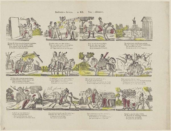 Curator: J. Proost's print, "Veldslagen, waar dat Mars zyn felle woed' kwam koelen," likely created between 1800 and 1833, is quite a complex narrative presented in a grid of vignettes. The scenes range from battles to more intimate moments of sorrow. Editor: My immediate impression is that there is a deliberate romanticizing of violence here, a way of depicting conflict and sacrifice for political gain in a digestible format. Curator: Exactly, the series of scenes are organized to create a specific heroic image, especially given the emphasis on warfare throughout and then followed up with quiet familial images near the conclusion. Notice how the artist relies on distinct iconographic formulas in his imagery, such as poses derived from classical antiquity or gestures representing mourning, reinforcing their symbolic associations. Editor: Absolutely. The figures, particularly the military leaders, are carefully arranged, a way of sanitizing history, even glorifying power and obedience to power. How do we read these images today in relation to colonialism and violent imperial expansion in other parts of the world? How does art support and advance cultural myths? Curator: The use of printmaking, etching and engraving, allows for widespread dissemination of such an aesthetic position; the impact multiplies beyond the singular object. What associations or resonances do these battle scenes trigger even unconsciously across decades or centuries? Are certain patterns in visual representations repeating themselves? Editor: That replication is precisely the problem, the romanticisation becomes normalised. As well, the intimate family scenes following the bloodshed have an impact; we could interpret it as Proost perhaps showing a need to establish continuity in times of conflict—establishing patriarchal stability, almost as a reaction to violent disruption. Curator: A necessary counterbalance to the devastation of war. Editor: For me, it reminds us of the ways violence becomes naturalized as necessary through repeated visual languages. Curator: Seeing the original print in full does allow us to more precisely discern historical beliefs as they were disseminated.