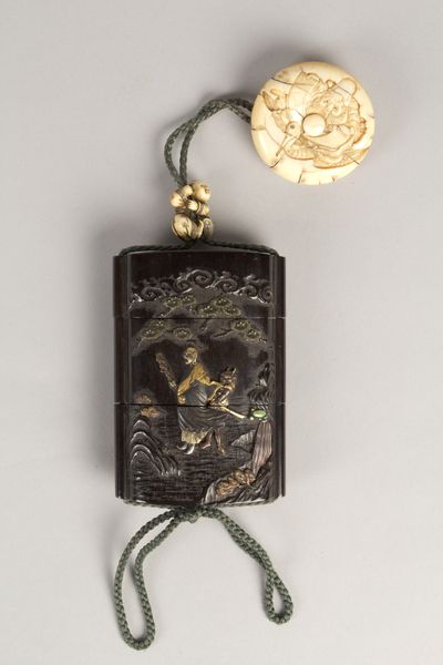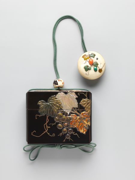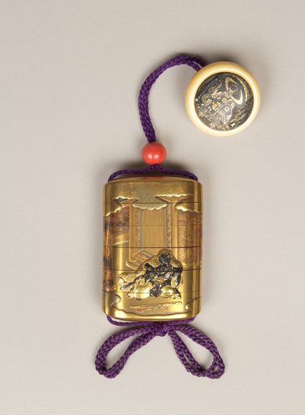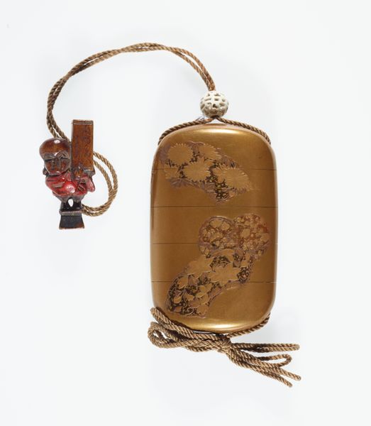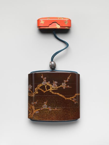 Curator: Let's discuss this rather lovely 19th-century Inrō with Peacocks and Flowers, presently residing at The Metropolitan Museum of Art. The artist credited is Koma Yasutada. Editor: My eye is immediately drawn to the peacock motif – a brilliant splash of gold against that glossy, dark background. There’s something both regal and delicate about it. Curator: Inro like this, which is crafted using ceramic material, functioned as portable cases. The artist, Yasutada, seems deeply invested in the decorative process. The careful layering of the design, from the blossoms at the bottom to the curve of the peacock’s neck. It gives the impression of dedicated labor. Editor: And consider the peacock itself! Throughout numerous cultures, it represents beauty, royalty, and immortality. The feathers especially—each one is an eye! Is Yasutada perhaps suggesting the idea of watching or being watched, adding a layer of mystery to this piece? Curator: Perhaps. Yet the question arises, doesn’t the peacock, in its opulent and dazzling presence, hint at the material conditions which allow for such displays of artistry? And in what specific contexts were the materials available for crafting the body of the inro and for embellishing it with elaborate floral scenes and birds? Editor: Interesting questions! I believe the symbolic value can sometimes intertwine seamlessly with its material existence. For instance, a peacock's vibrant display might require access to certain pigments or dyes that would have also held their own symbolic importance or trade value. Curator: So, is the "Orientalism" classification listed really appropriate? It has a very strong visual relationship with traditional, native aesthetic practices. It seems unlikely this was meant to fulfill some kind of European fantasy or gaze. Editor: That's fair, and perhaps the term simplifies its complexity too much. It does invite contemplation on the relationship between cultural appreciation and possible misrepresentation. It shows how Asian art was consumed and interpreted through a Western lens at the time. Curator: Very well said. It also encourages further questions about which community created this Inro for their community, and where those cultural roots came from. Editor: Indeed. By exploring both the symbolic language and the material realities behind such pieces, we get a more nuanced understanding of art and its journey through history. Thank you!