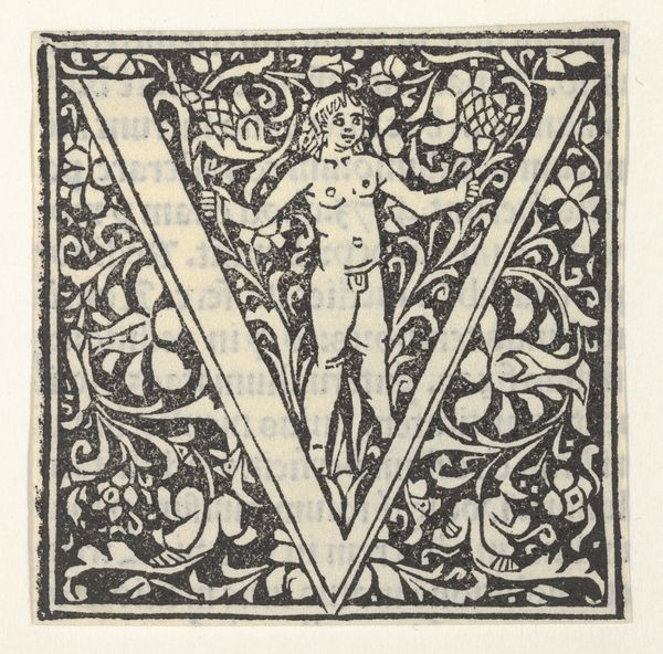 This is an ornamented letter ‘V,’ an initial probably intended for use in a printed book, made by an anonymous artist. The design combines the austere geometry of the letterform with the intricate swirls of foliate ornament. Consider the historical context: the advent of the printing press democratized knowledge, but also standardized it. Individual expression became less common in the creation of texts. How might this have affected artists? Did the division between the visual and textual arts become more pronounced? The artist makes interesting choices, framing the ‘V’ by coiling, organic shapes, highlighting a tension between the mechanical and the natural. The image encapsulates a moment of transition, reminding us of the complex interplay between technological progress and artistic expression. It invites us to ponder the human desire for beauty and individuality amidst standardization.
