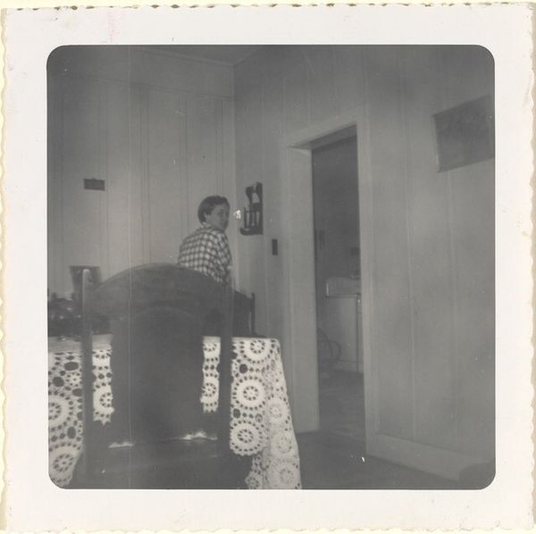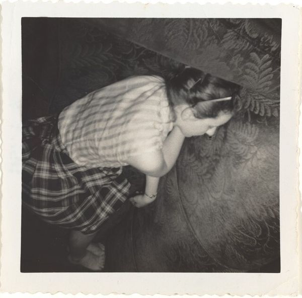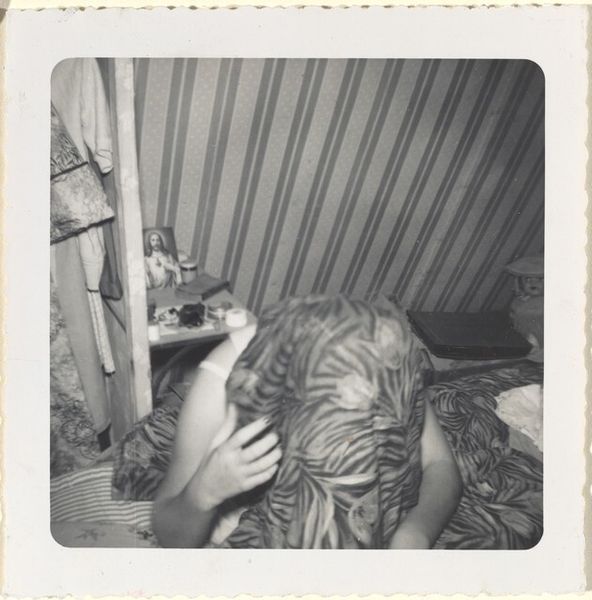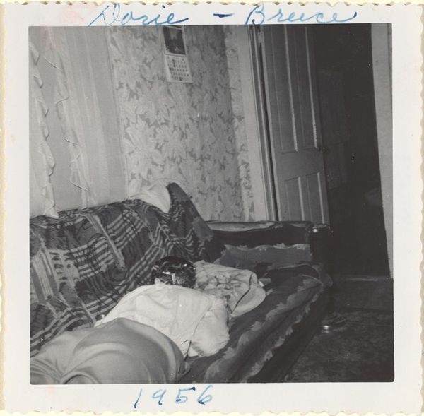 This photograph, "Dorie, 7-57," captures a figure collapsed on a sofa, their face hidden, an arm cast over their head in what appears to be utter exhaustion. This pose, the body in repose, resonates with the classical motif of Ariadne abandoned, a visual shorthand for deep emotional anguish. Consider the ancient sculptures of weary figures, nymphs, or mourning women, where the slumped posture and veiled face speak to a profound inner turmoil. This gesture evolves; we see it echoed in countless depictions of grief, of suffering, spanning eras and cultures. The act of shielding one's face, seen here, becomes a universal language of emotional retreat, a primal instinct to protect oneself from an overwhelming world. Such visual echoes reveal how the human psyche grapples with universal experiences, projecting them onto art in a continuous, evolving narrative. The photograph becomes a modern echo, a fleeting moment captured, forever linked to the timeless depiction of sorrow.