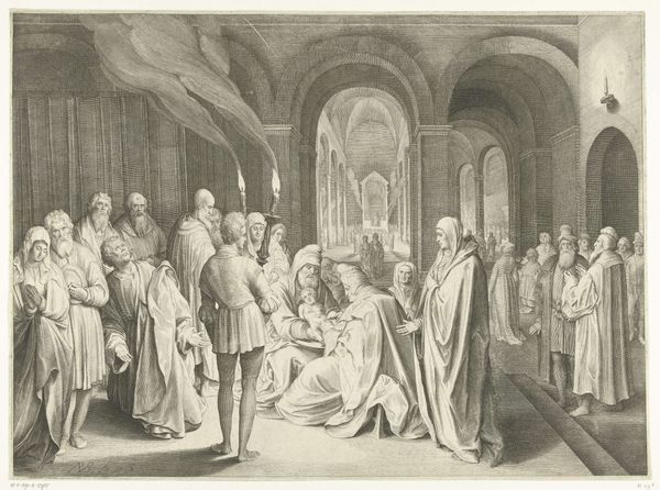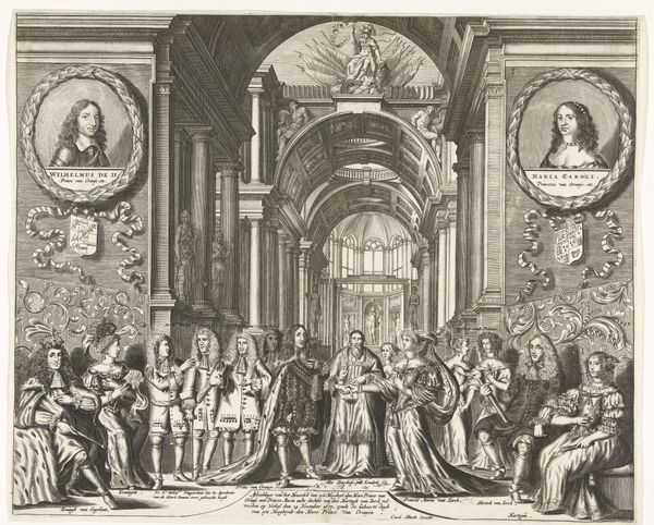 Theodor Matham created this print titled 'Koning Karel II van Engeland spreekt de staande leden van de Staten-Generaal toe' in 1660. It captures a formal encounter between King Charles II of England and the States-General of the Netherlands, a meeting heavy with the weight of political negotiation and the restoration of the English monarchy. Consider the optics: portraits of previous rulers loom over the assembly, underscoring the historical legacies at play. The print offers a glimpse into the gendered dynamics of power, as women are relegated to the background, their presence a quiet contrast to the all-male assembly. The negotiation table becomes a stage for national identity and sovereignty as Charles II addresses the States-General. Matham’s composition compels us to consider the complexities of diplomacy, the weight of history, and the silent roles assigned to different participants in the theater of power.