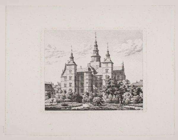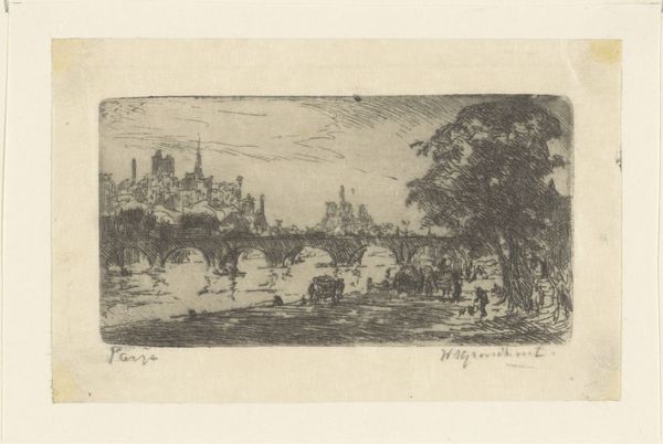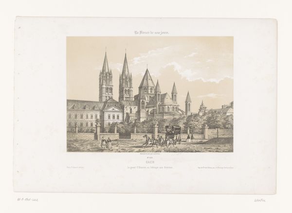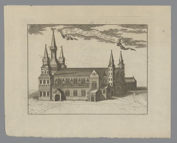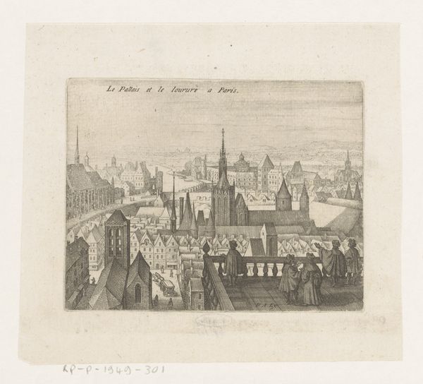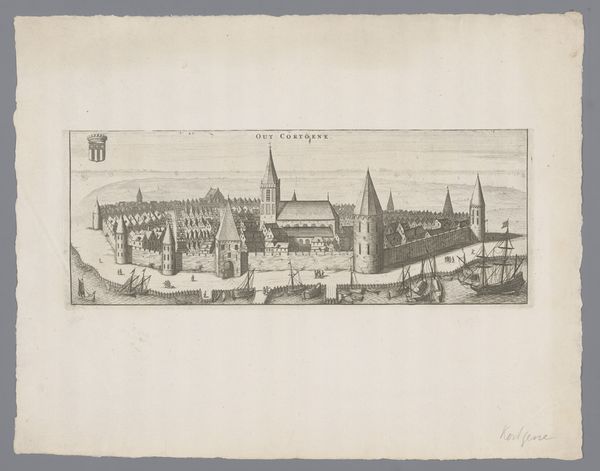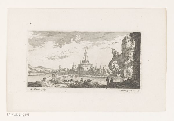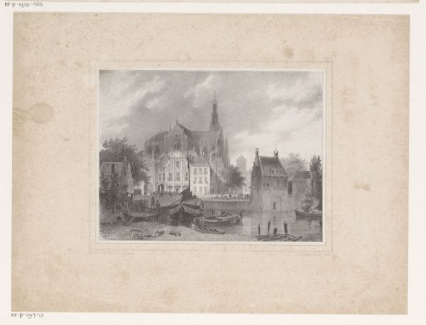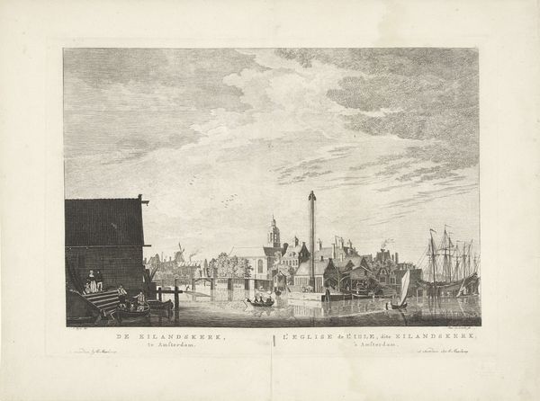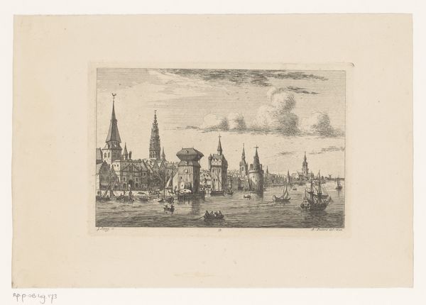 Jean Théodore Joseph Linnig created this detailed etching, "Gezicht op de werf in Antwerpen," capturing a bustling Antwerp shipyard. The composition, a horizontal rectangle, is bisected by the horizon line, grounding the architectural forms against an expansive sky. Linnig masterfully uses line and texture to create depth. Notice the intricate network of lines that define the buildings, creating a dense visual texture. This is contrasted with the smoother, more open sky, drawing the eye upwards. The interplay between light and shadow is carefully rendered, giving the scene a sense of atmospheric perspective. The structural elements of the shipyard—towers, spires, and cranes—are not merely representations of the real but become symbolic of industry and progress. The etching method itself, with its capacity for precise detail, mirrors the industrious nature of the scene. Linnig's work then, goes beyond a simple depiction, prompting reflection on urban development and human endeavor.