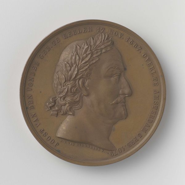 Editor: This is The Punjab Medal of 1848 and 1849, made in 1849 by William Wyon. It's a bronze medal, and it has such a solemn feel. I'm intrigued by its stark simplicity. What do you see in this piece? Art Historian: Well, isn't she a commanding presence in such a small space? For me, medals are tiny time capsules. They hold history but also a mirror to how a society wished to see itself. Editor: How so? Art Historian: The choice of Queen Victoria, for example. It says, 'Here is stability, here is empire'. This isn't just bronze; it’s a statement, a carefully crafted narrative cast in metal. Look how her gaze is fixed forward - strong jaw line. And those delicately engraved details – her tiara, the curls of her hair! Almost photographic. Editor: It seems like such a celebration of her. I guess I had not thought of it being political too. Art Historian: Every image of power is a political act, wouldn’t you agree? And consider the purpose – this was given to those involved in the Punjab campaign. Medals were an incentive to continue working and a reminder of how their effort helped contribute to England’s global power, wrapped in artistry, of course. Do you think that the beauty changes your perspective? Editor: It definitely adds another layer. I can see this piece as less 'objective history' now. Art Historian: Exactly! Now imagine the medal’s weight in your palm. It would be more than bronze, wouldn't it? Almost the weight of history! Editor: I am going to remember that: A weight of history in the palm of my hand. Thanks for illuminating so many different elements!