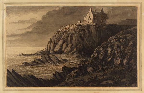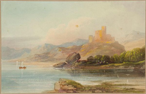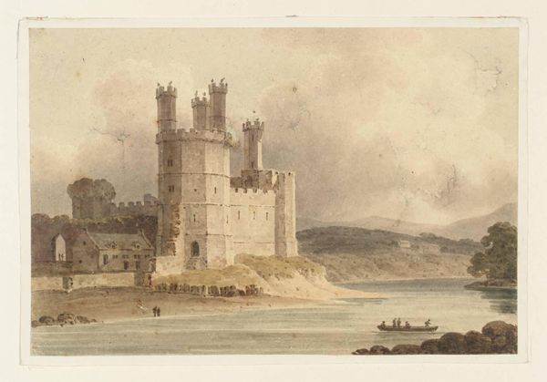 Curator: Before us is Nicholas Pocock's watercolor, "Part of Tenby from the Beach near the Pier," a view rendered with a delicate hand. Editor: It feels so muted, almost melancholic. The fortified structure looming over the beach evokes a sense of isolation. Curator: The tower, a symbol of authority and protection, also suggests the weight of history, the endless cycle of defense and vulnerability. Editor: And who built it? What power structures dictated that it was needed? Whose protection was it, and who was excluded? Curator: These coastal fortifications were often about controlling trade routes, but also about projecting an image of strength. Editor: An image that perhaps veiled internal social fractures and the exploitation of the local population. Curator: Precisely. The landscape then becomes a stage for power dynamics. Editor: A reminder that even seemingly serene scenes carry the echoes of human conflict and inequity. Curator: A sober reminder, indeed. Editor: I'll carry that with me.