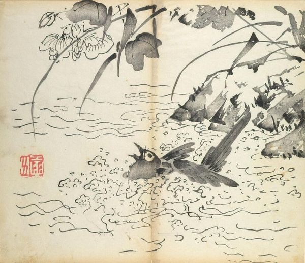 Curator: This is an illustration called "Two Birds on a Flowering Branch" by Hu Zhengyan, created as part of the "Ten Bamboo Studio Manual of Calligraphy and Painting". Editor: It's incredibly delicate, isn't it? Almost feels like a fleeting moment captured with ink. So subtle and soft. Curator: Hu Zhengyan lived during the late Ming Dynasty, and this work reflects the era’s interest in the natural world, particularly as expressed through woodblock printing techniques. Editor: I'm mesmerized by the way the birds are perched so gently on the branch, you can almost feel the slight sway. It makes me think of nature's simple beauty. Curator: The manual it comes from was hugely influential in popularizing artistic styles and techniques among a wider audience. So this wasn’t just art, it was also a tool for art education! Editor: Funny how something so serene could be so pedagogically charged! I’ll look at birds differently now.