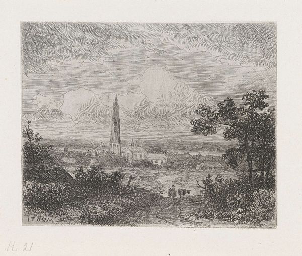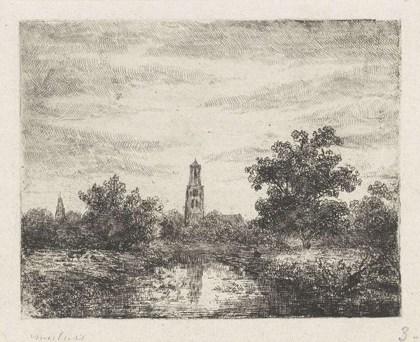 "Landschap met overtoom," or "Landscape with a portage," was etched by Johannes Arnoldus Boland, a Dutch artist born in the late 1830s. This detailed landscape offers a glimpse into 19th-century Dutch rural life. The portage itself, used to transport boats over land, is a reminder of the labor and ingenuity required for trade and travel in this period. The church in the background, a central structure of the town, gives this close-knit community a sense of shared identity and purpose. Boland’s choice to depict this scene invites us to consider how people interacted with and shaped their environment. The meticulous lines of the etching emphasize a connection to the land and the daily lives of its inhabitants. This piece is an invitation to reflect on a time when communities were tightly bound to their local landscapes and on how these interactions defined their culture and identity.