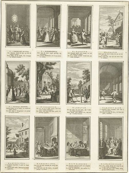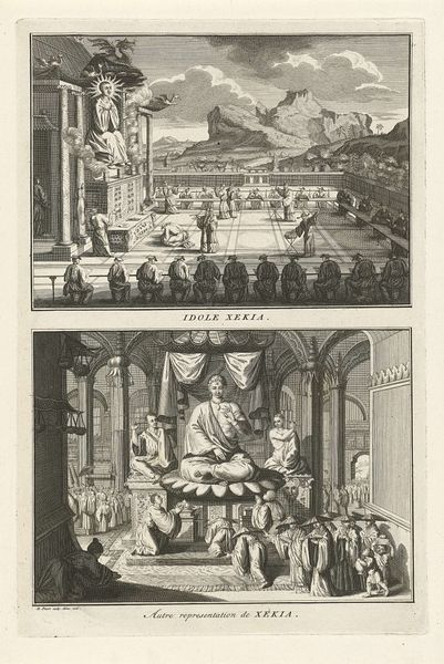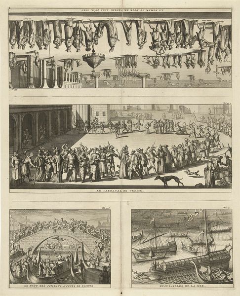 Curator: Here we have "Jubeljaar in de rooms-katholieke kerk," an engraving by Bernard Picart, dating back to 1722. Editor: Six vignettes frozen like little windows, black ink on white. It's somber but lively—grand architecture contrasted with tiny, scurrying figures. Almost feels like a religious comic strip! Curator: Picart masterfully depicts different aspects of the Jubilee year in the Catholic Church through this print. Notice how he meticulously details the architecture in each scene. It's fascinating to see how he uses line and perspective to create a sense of depth despite the limitations of the engraving medium. Editor: Yes, and consider the labor involved, all those tiny lines cut by hand! Each vignette focuses on a key ritual or ceremony. It’s an impressive feat of printmaking for its time. The entire printing and dissemination process, the networks needed…that speaks volumes about the influence of the Church at that point in history. Curator: Precisely! These prints were likely mass-produced, a form of visual propaganda almost. The scale of production tells us something important. We can examine the economics of art through distribution like this. And consider the paper it’s printed on, likely made from rags, reflecting material constraints of the time… Editor: It all makes me wonder who consumed this? It feels aspirational and almost other-worldly. Imagine participating in such events with throngs of faithful – how was the print intended to influence the public, beyond being just a representation of key ceremonies? The clothing, the buildings, everything about this artwork points to such deliberate social statements through the materials of creation, print being a tool in this period! Curator: I agree entirely. It offers valuable insights into 18th-century religious practices and visual culture and their interaction with materials. Thank you! Editor: Always a pleasure—art seen through a material lens tells the greatest stories!